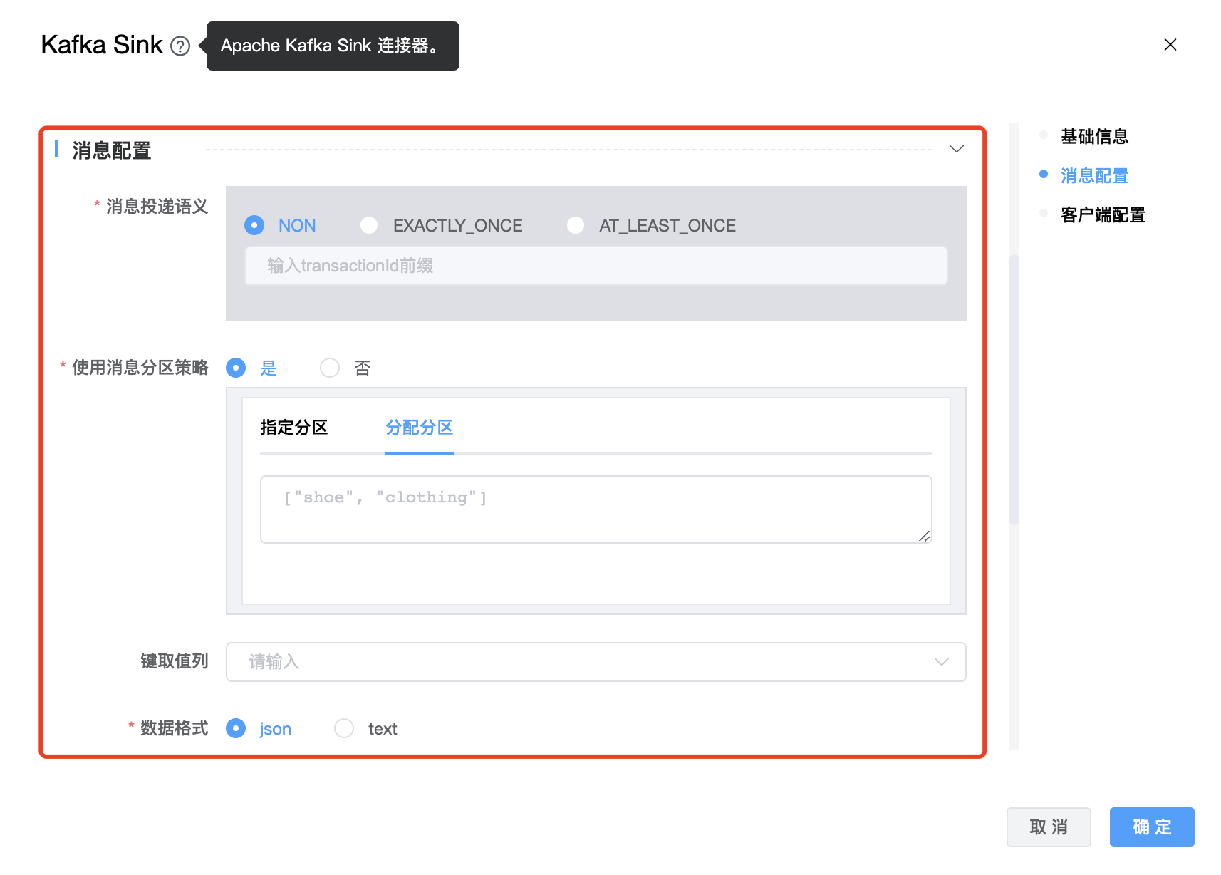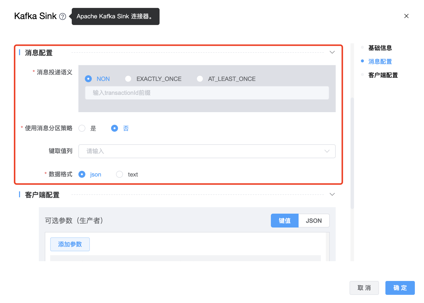 | 消息投递语义 | 消息投递语义支持三种:NON、EXACTLY_ONCE、AT_LEAST_ONCE,默认 NON。 EXACTLY_ONCE,生产者将在 Kafka 事务中写入所有消息,这些消息将在检查点上提交给 Kafka。 AT_LEAST_ONCE,生产者将等待 Kafka 缓冲区中所有未完成的消息被 Kafka 生产者在检查点上确认。 NON 不提供任何保证:如果 Kafka 代理出现问题,消息可能会丢失,并且消息可能会重复。 |