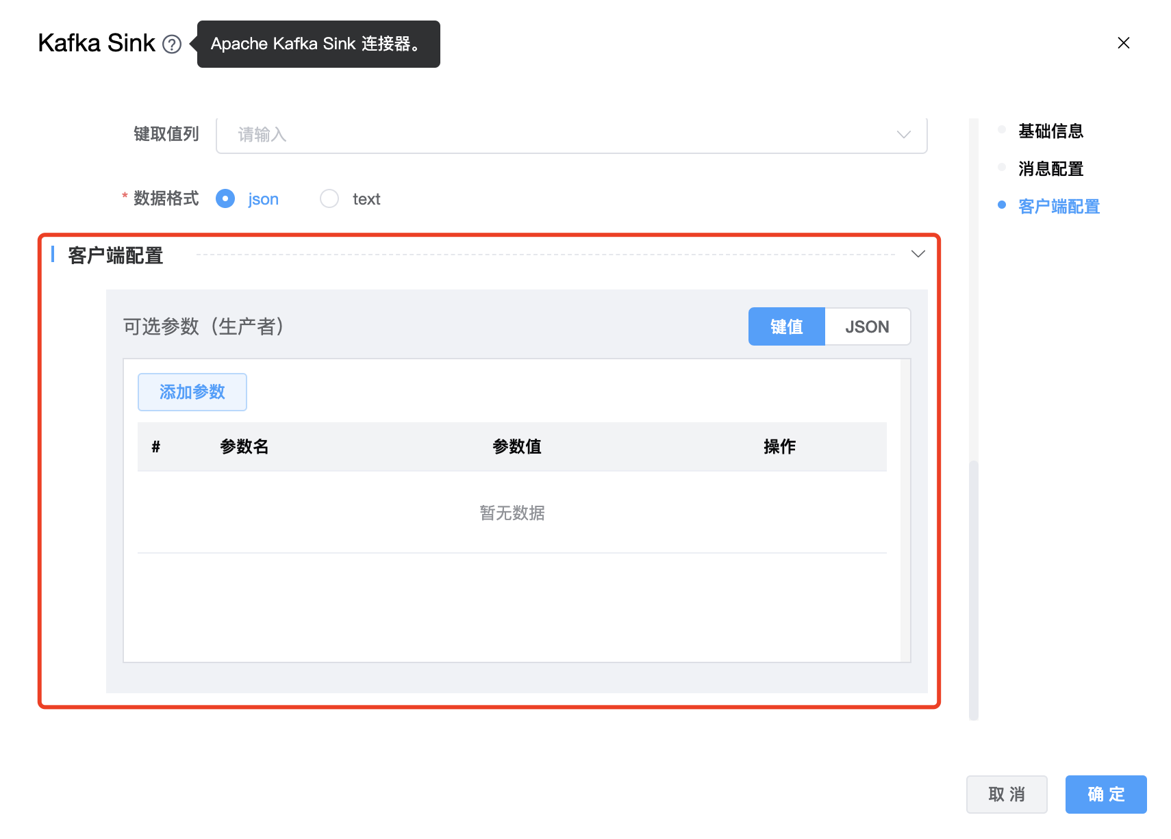 | 可选参数 | Kafka Sink 的其他参数,用户可以根据需求进行配置。 |