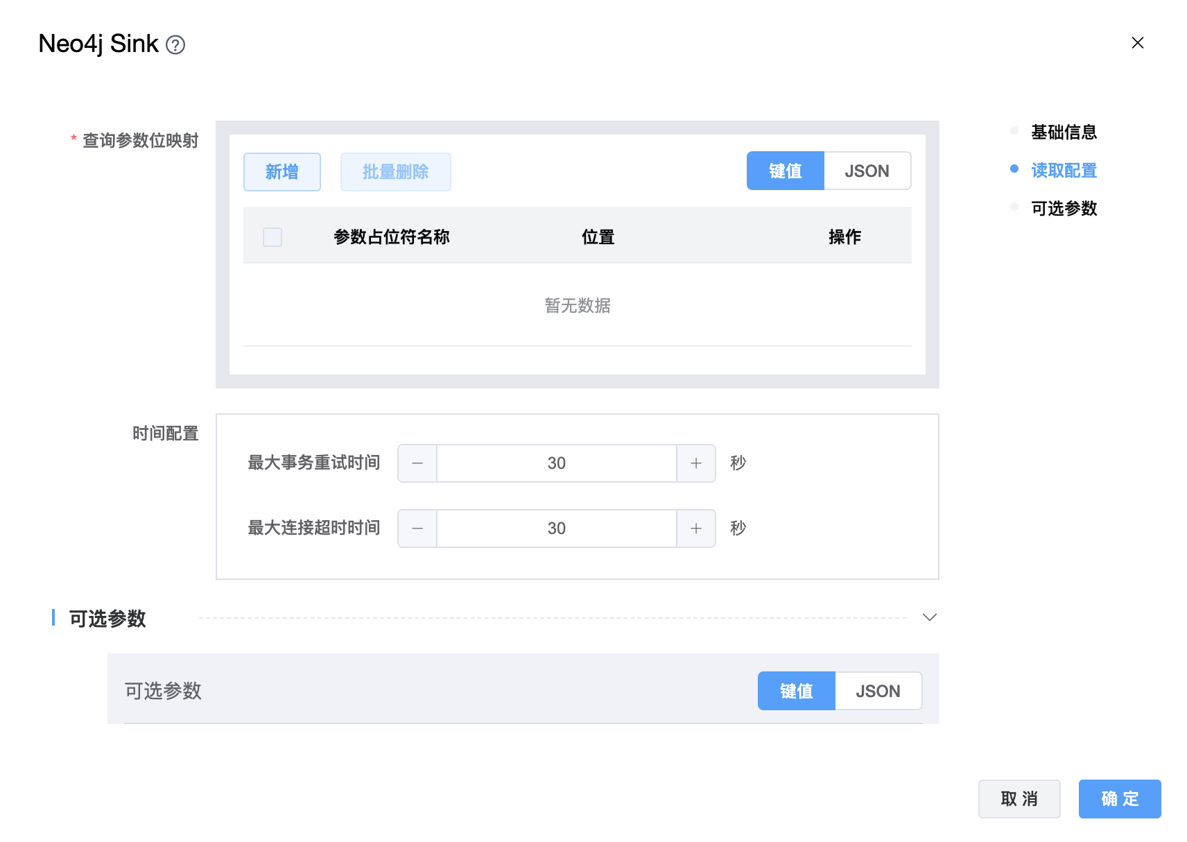 | 查询参数位映射 | 查询参数的位置映射信息。关键字名称是参数占位符名称。关联值是输入数据行中字段的位置。 |