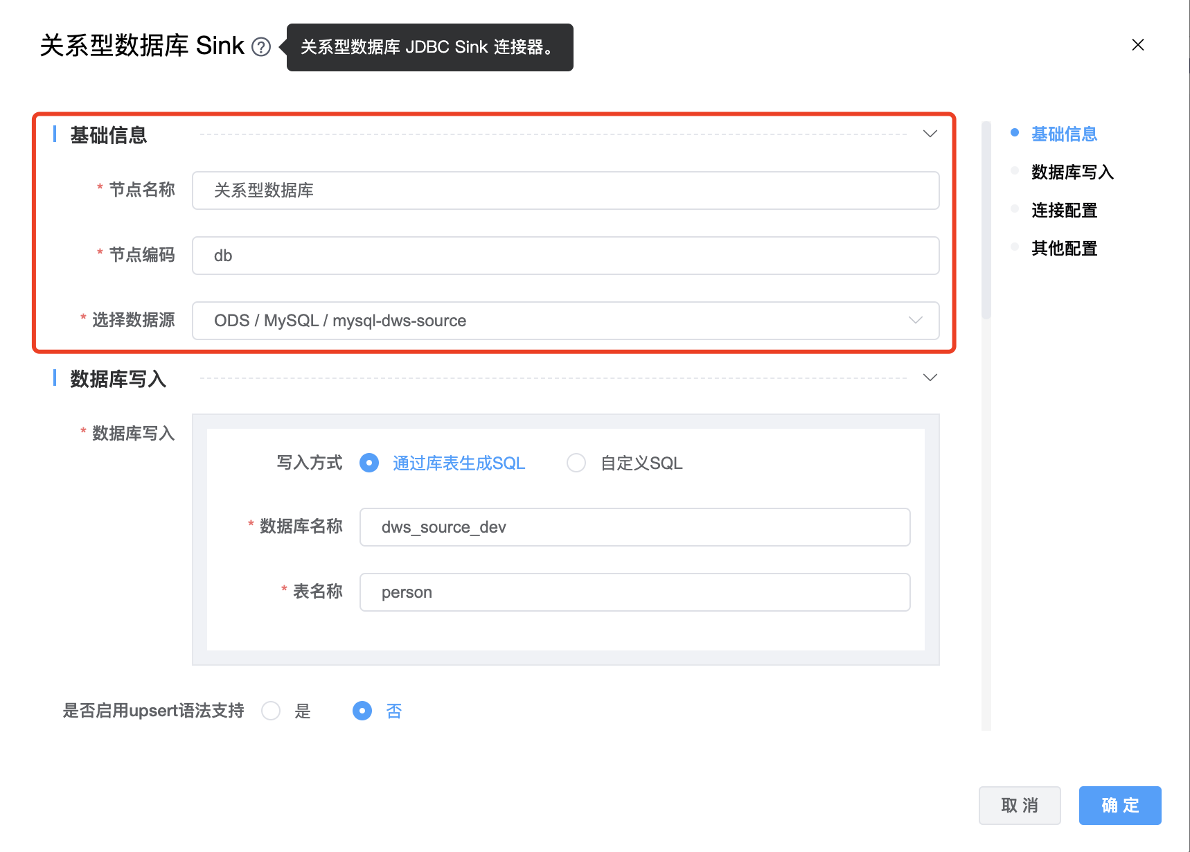 | 节点编码 | 当前创建的关系型数据库 Sink 节点编码,由用户自定义且不可为空。命名可包含字母、数字、下划线。 |