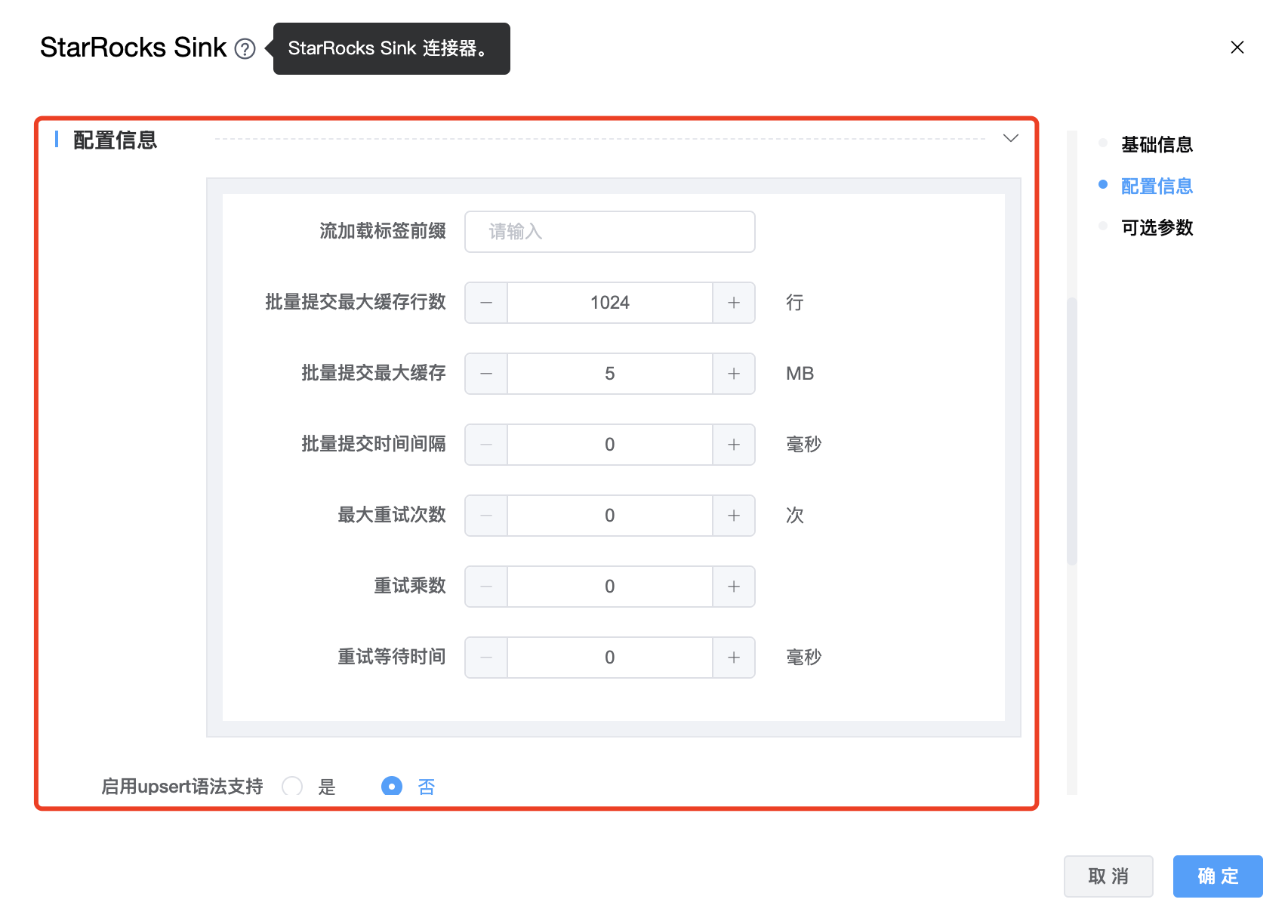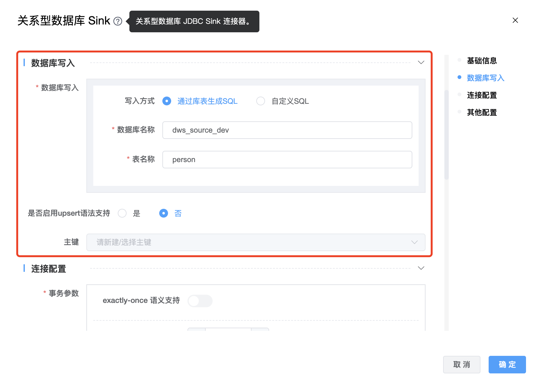 | 是否启用upsert语法支持 | boolean 类型。如果选择"是",需要设置"主键",如果选择"否",则不需要设置"主键"。根据查询主键是否存在,选择使用INSERT sql、UPDATE sql来处理更新事件(INSERT、UPDATE_AFTER)。此配置仅在数据库不支持 upsert 语法时使用。 注意:此方法性能低下 |