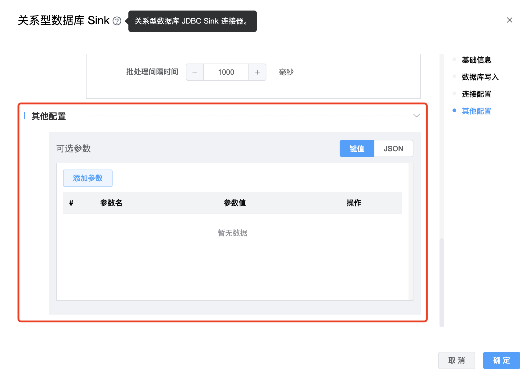 | 可选参数 | 关系型数据库 Sink 的其他参数,用户可以根据需求进行配置。 |