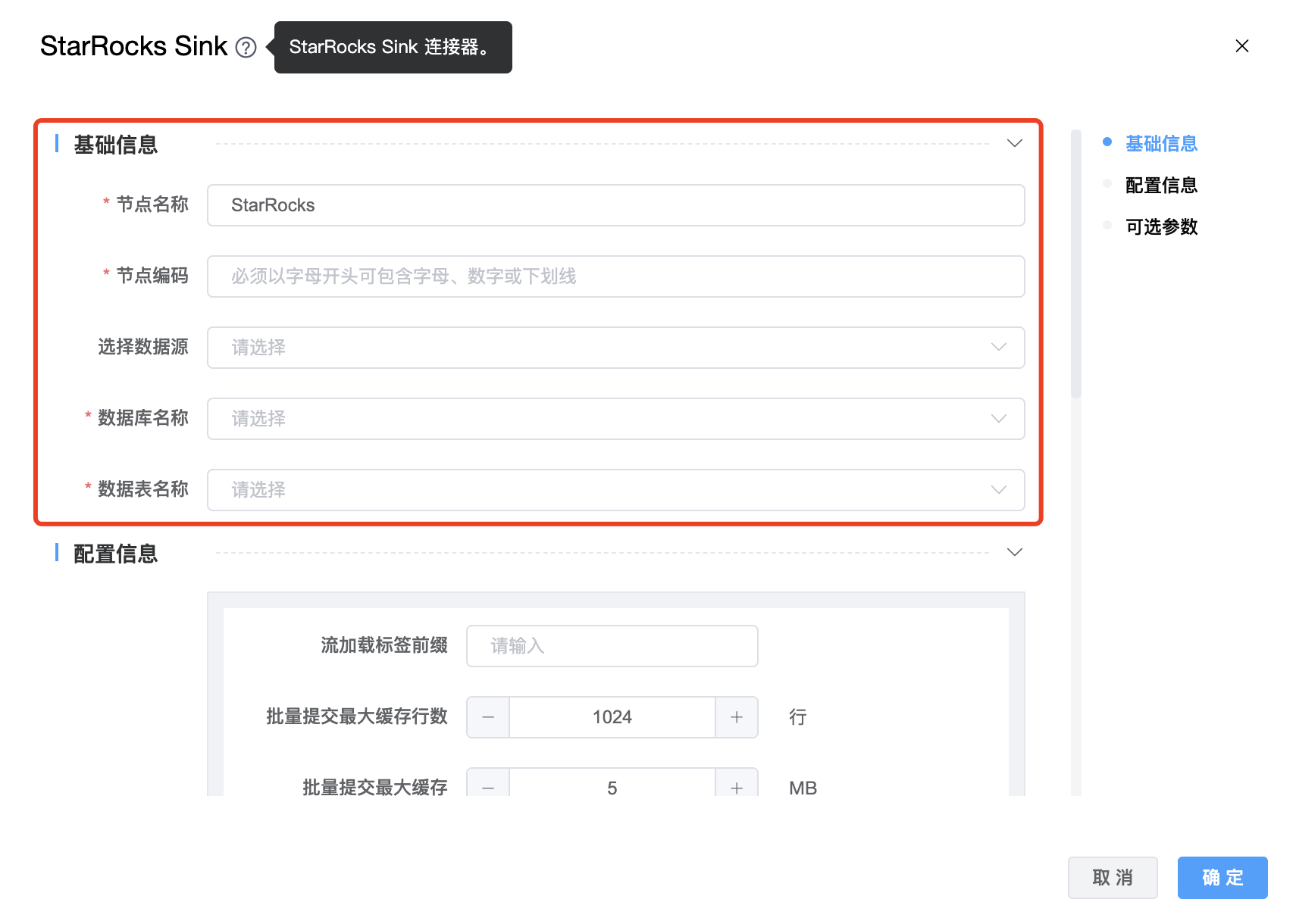 | 节点编码 | 当前创建的 StarRocks Sink 节点编码,由用户自定义且不可为空。命名可包含字母、数字、下划线。 |