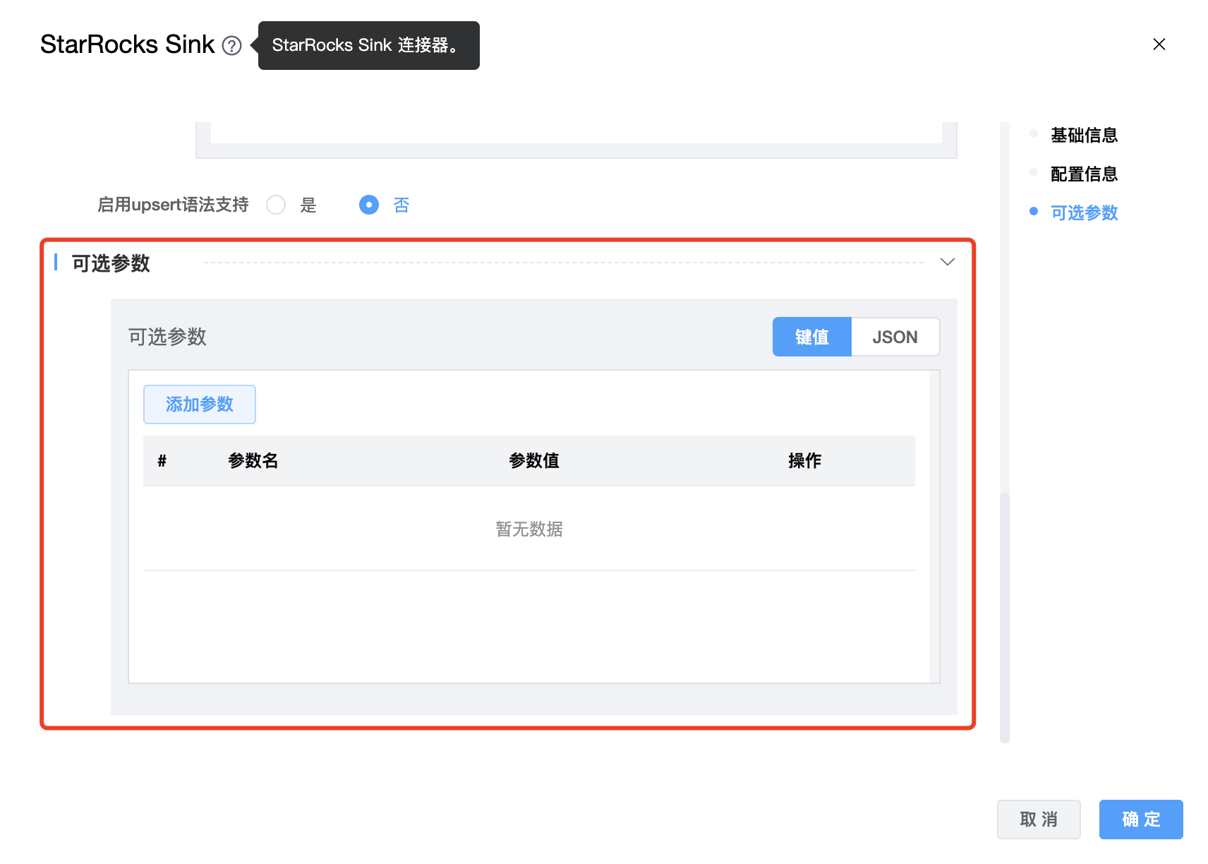 目前可选参数可配置如下:schema_save_mode、data_save_mode、http_socket_timeout_ms、starrocks.config