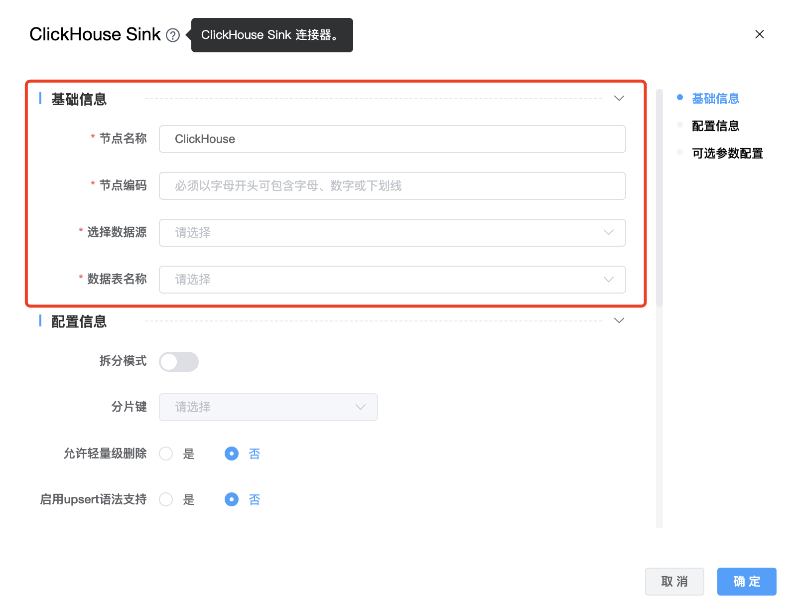 | 节点编码 | 当前创建的 ClickHouse Sink 节点名称,由用户自定义且不可为空。命名可包含字母、数字、下划线。 |
