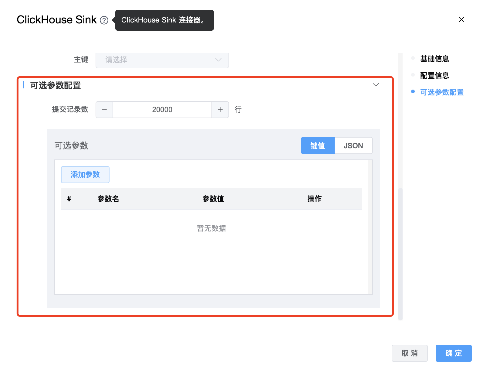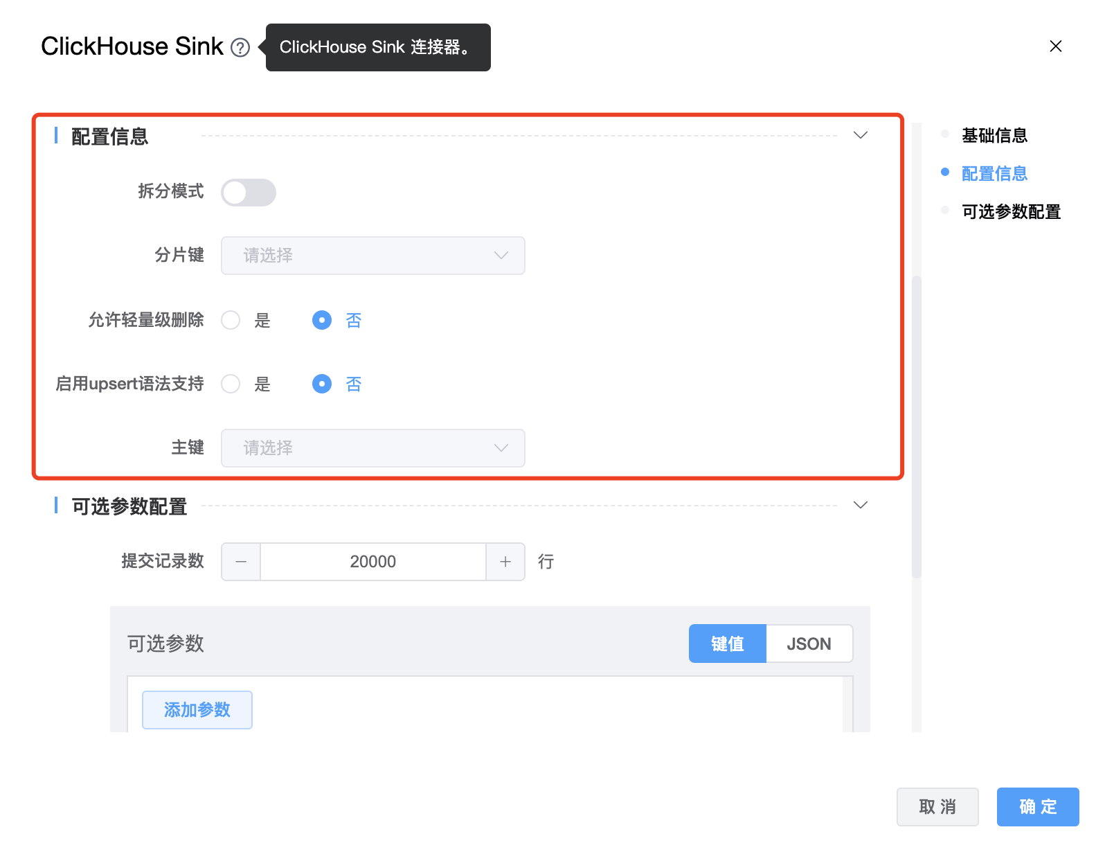 | 可选参数 | ClickHouse Sink 的其他参数,用户可以根据需求进行配置。 |