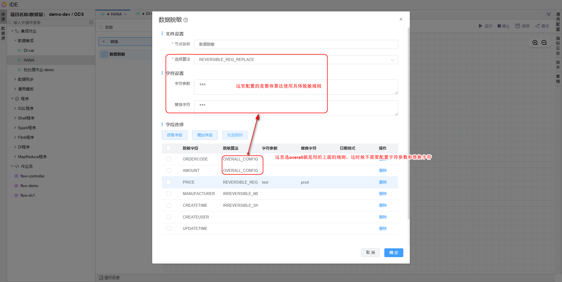 功能介绍:数据脱敏用于根据元数据系统采集某表字段信息,对此表抽取的数据中的某些列字段内容,进行数据脱敏,选择脱敏算法,对选择的字段值进行处理。