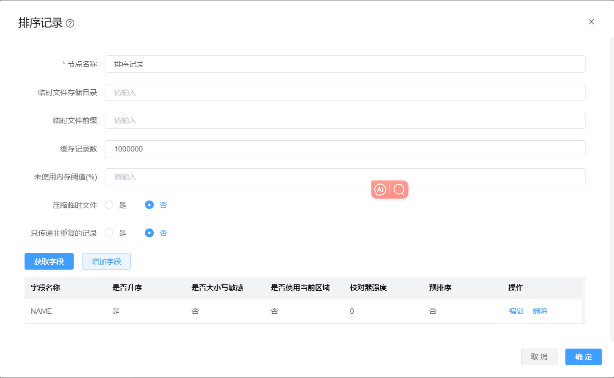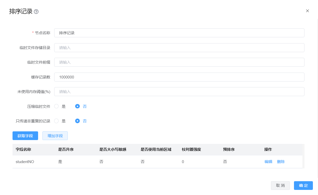 | 字段 | 字段名称:从前置步骤输出流中指定排序的字段名称,可用多个字段进行组合排序 |
