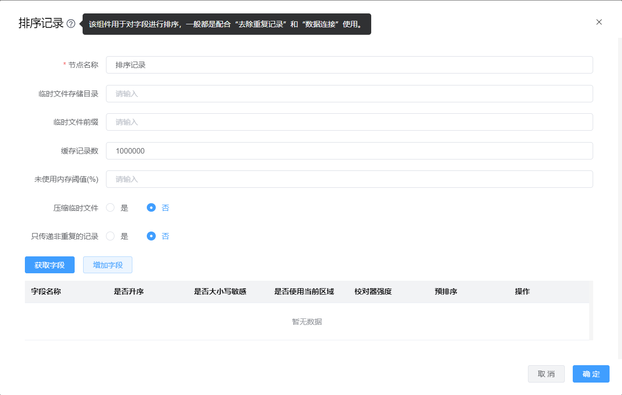 功能介绍:排序记录用于对字段进行排序,一般都是配合“去除重复记录”和“数据连接”使用,可以根据指定的字段对所有记录进行排序,可按升序或者降序。
