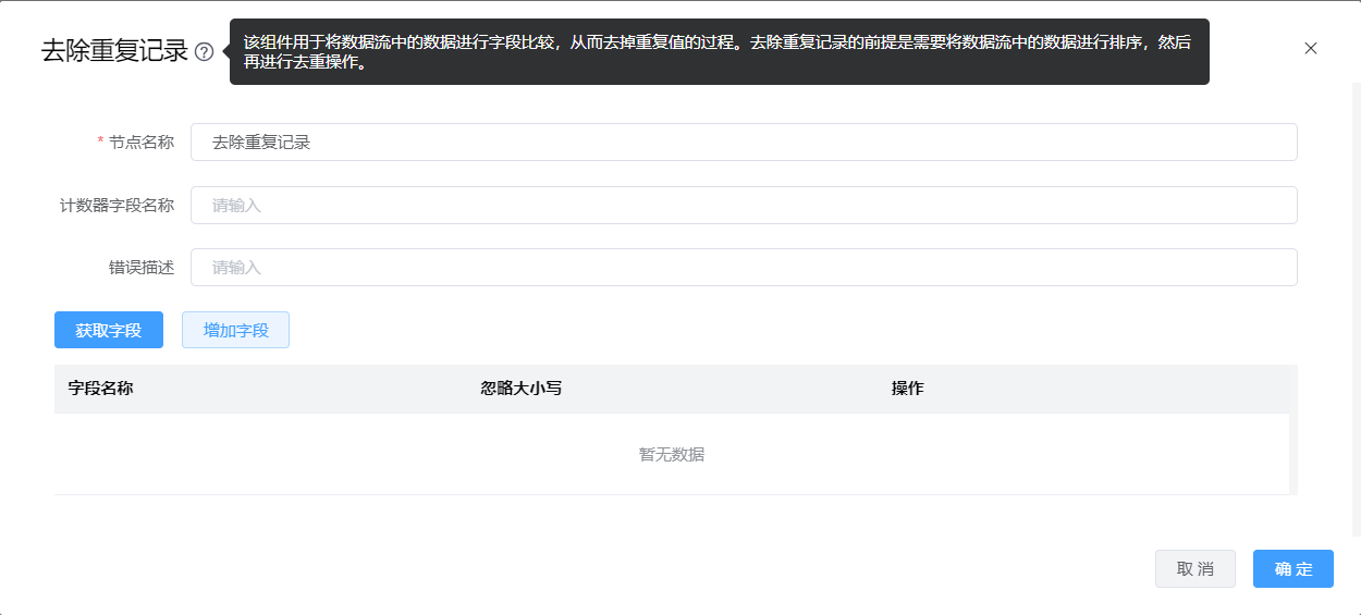 功能介绍:去除重复记录用于将数据流中的数据进行字段比较,从而去掉重复值的过程。去除重复记录的前提是需要将数据流中的数据进行排序,然后再进行去重操作。从输入流中获取字段值,进行去重操作,在使用此组件之前需对表数据进行排序,可以在前置组件例如表输入中进行 order by。