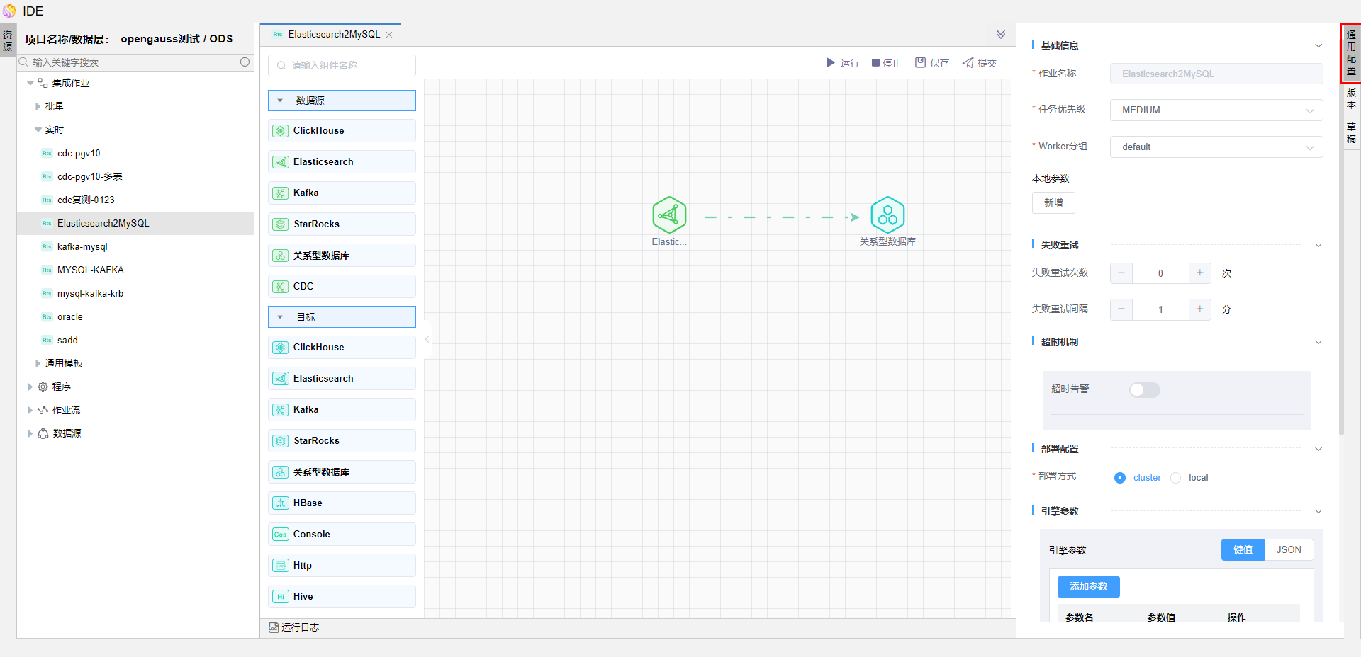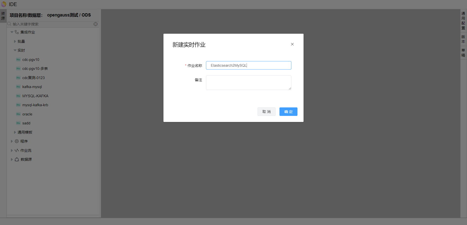 点击资源树节点上的【...】,选择弹出菜单【新建实时作业】,填写作业名称,点击【确定】按钮。