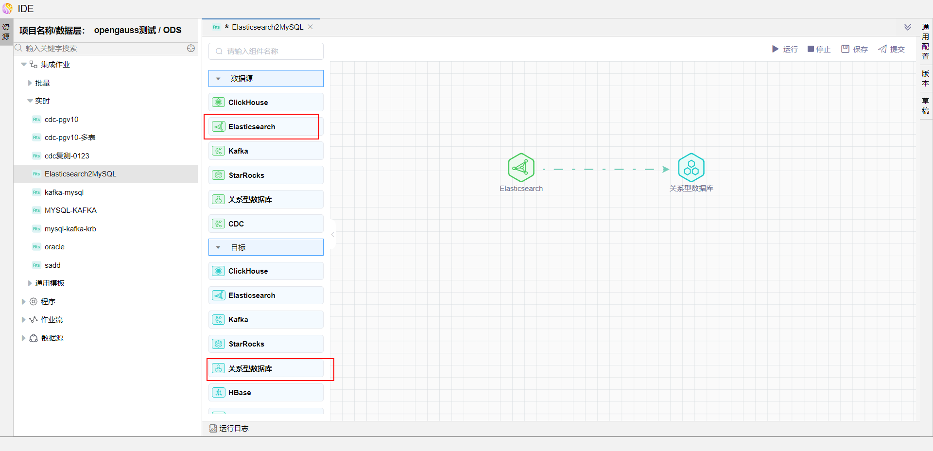 在画布中分别拖拽 1 个"Elasticsearch数据源"图元、1 个"关系型数据库目标"图元,并建立连线。