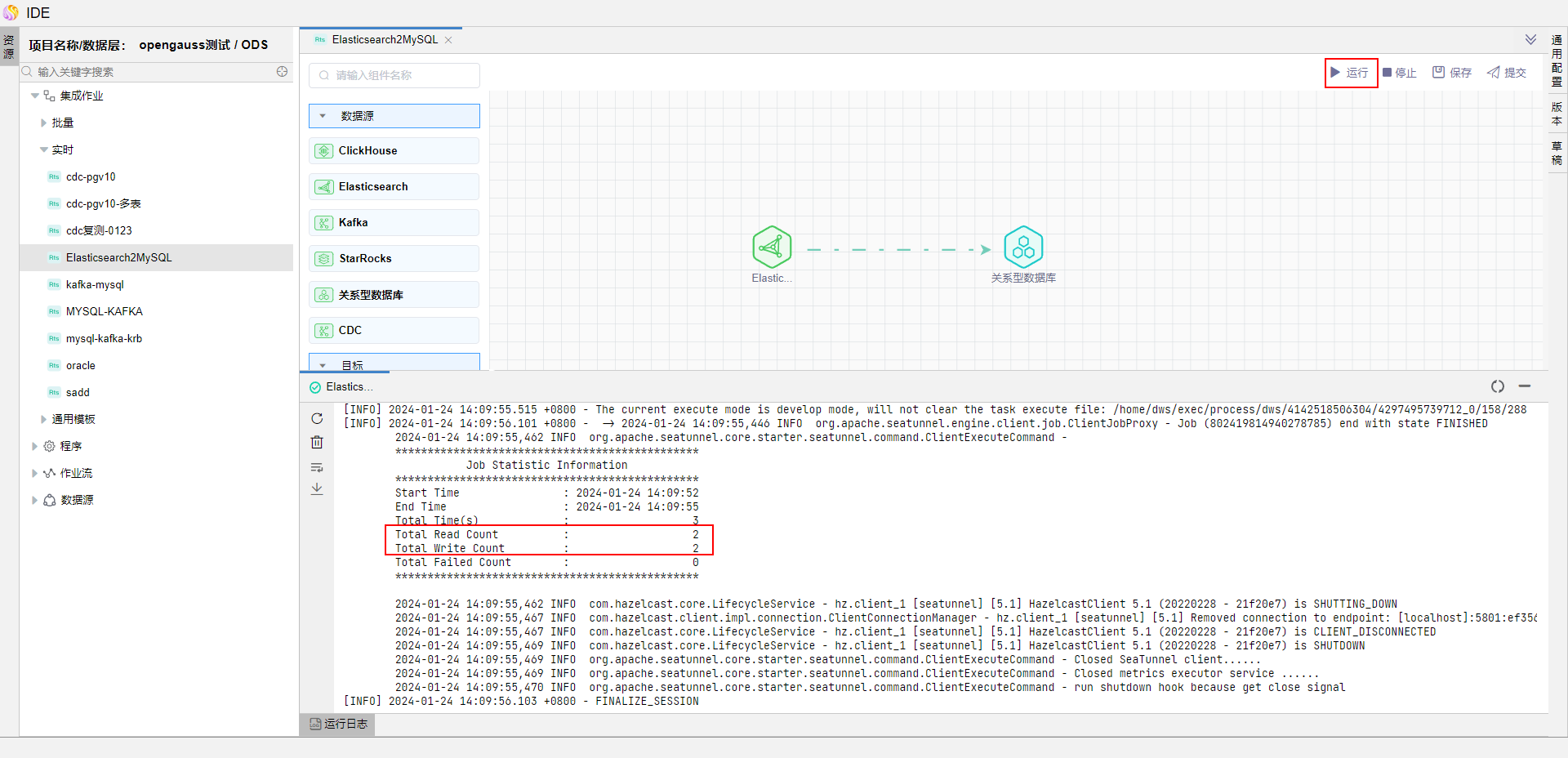 点击【运行】按钮,可以运行已经开发完毕的场景,在日志栏可以看运行日志及运行结果。