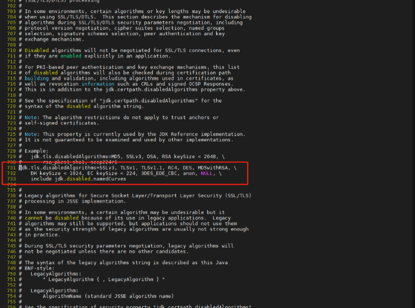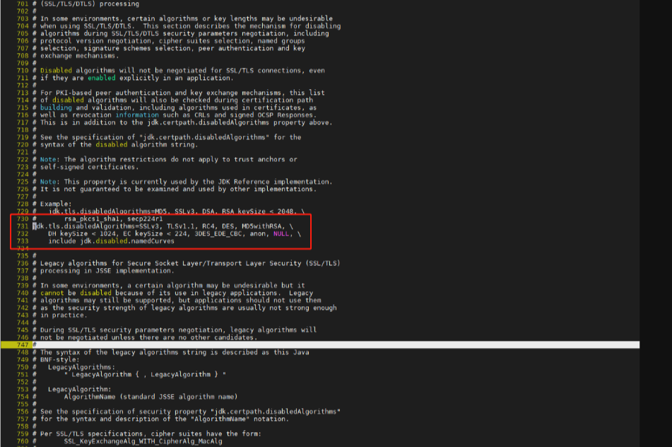 3、进入编辑模式后,通过/ jdk.tls.disabled搜索到准确的行,按下i,开启编辑,去掉其中的tlsv1