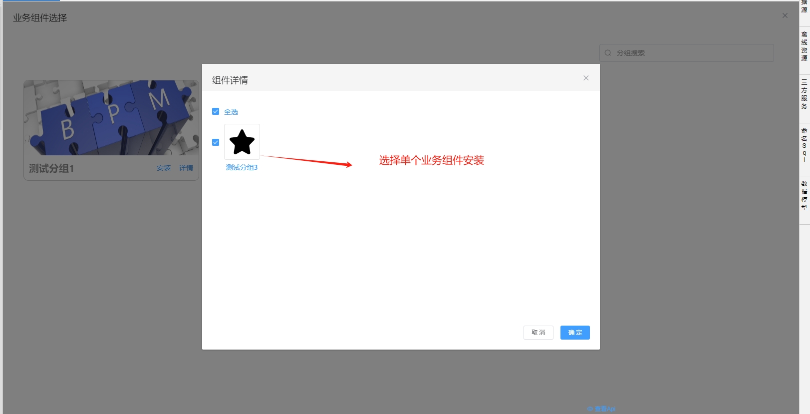 1.勾选需要导出的业务组件导出。