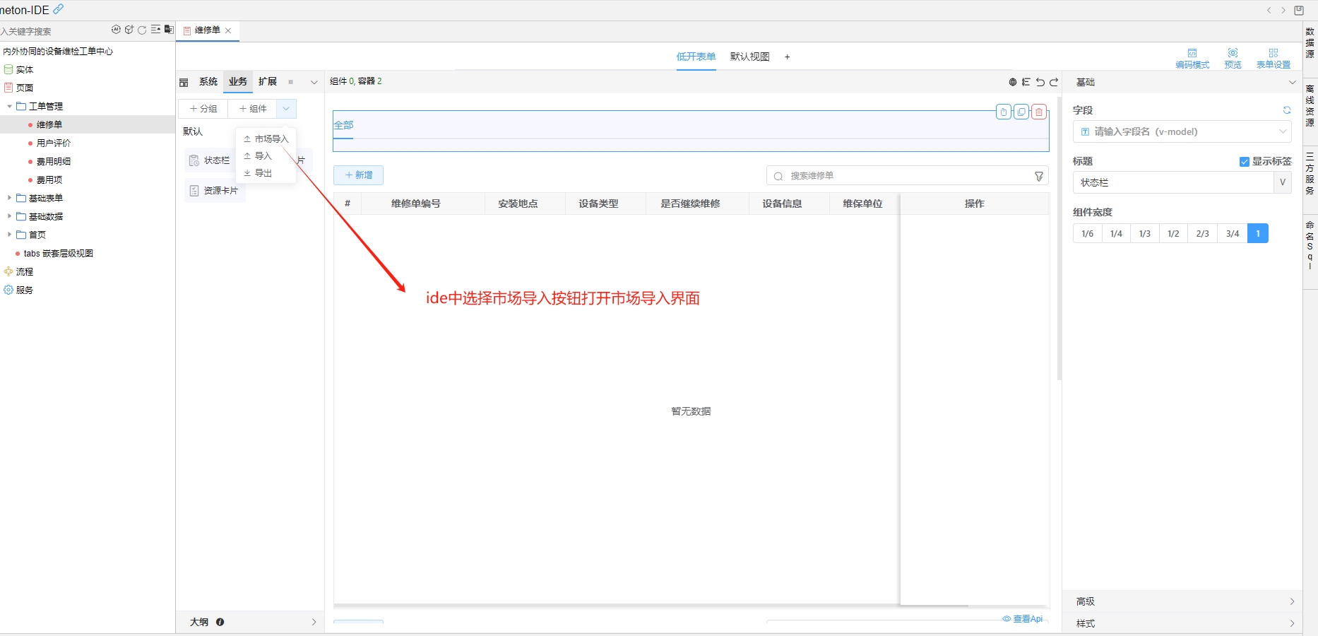 1.在IDE中打开市场导入界面,选择按组导入业务组件或者点开详情,选择单个组件导入