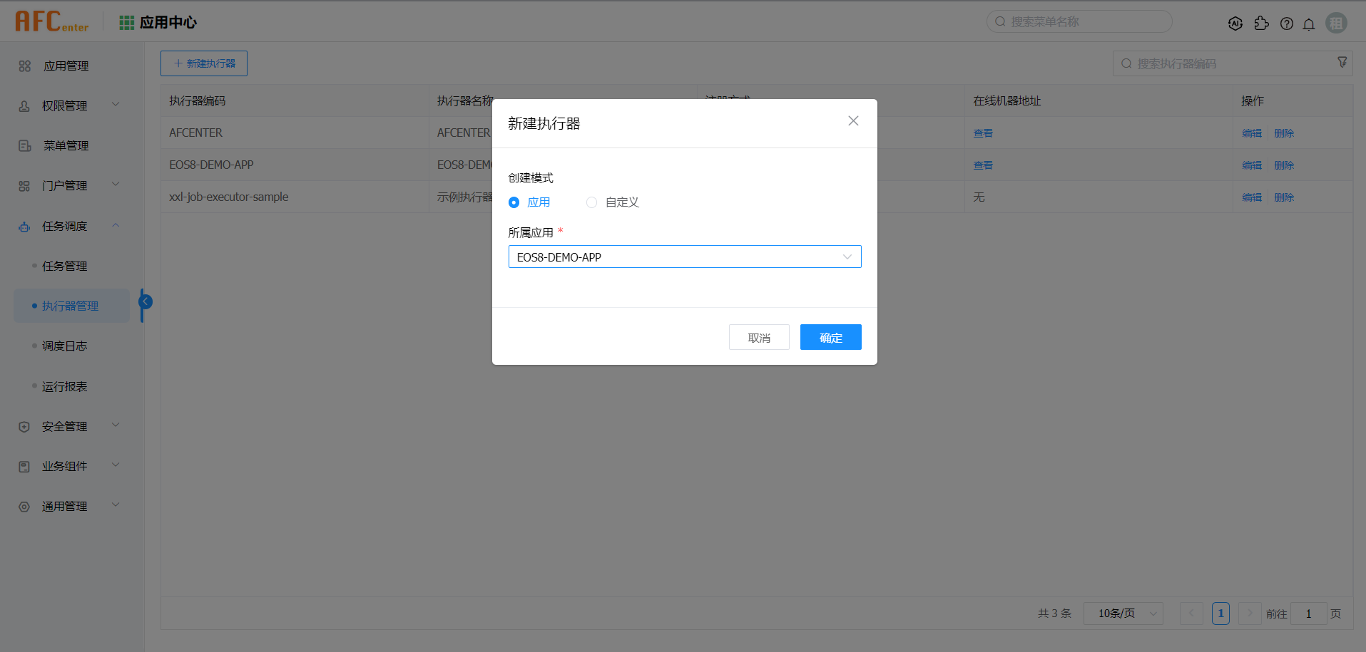 创建模式分为应用、自定义两种模式, 若创建模式选择应用,下拉选择应用; 若创建模式选择自定义,输入执行器编码、执行器名称,注册方式选择自动注册,即执行器配置中地址保存,可查看在线机器地址。