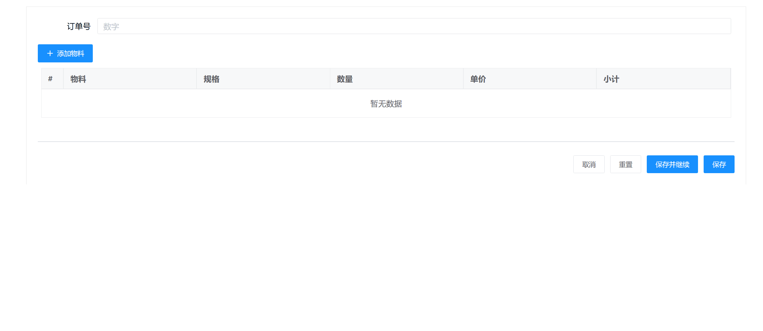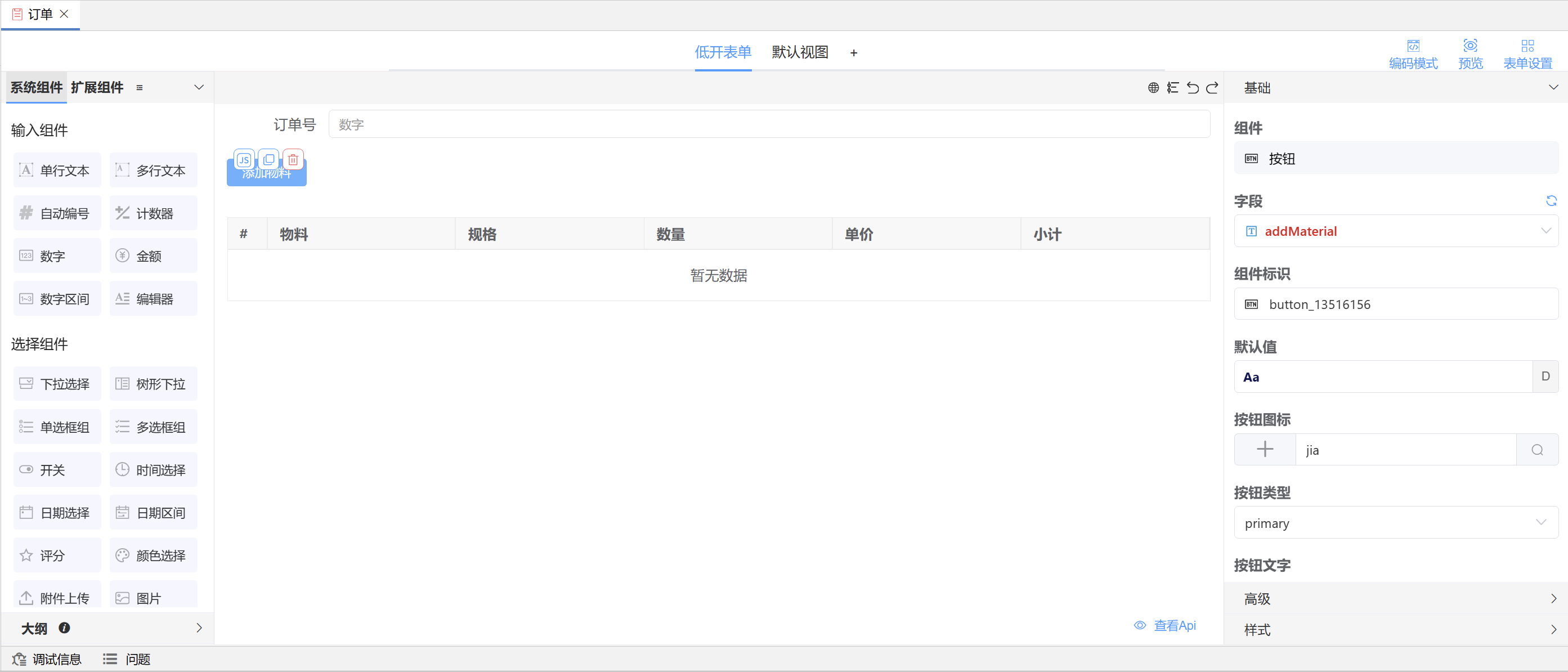 在订单页面中,添加按钮,字段为自定义字段,显示名称为添加物料。