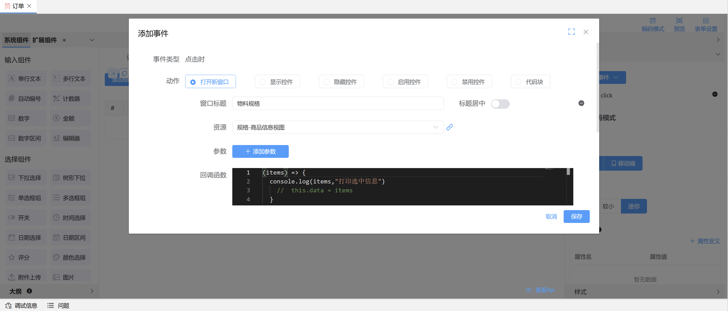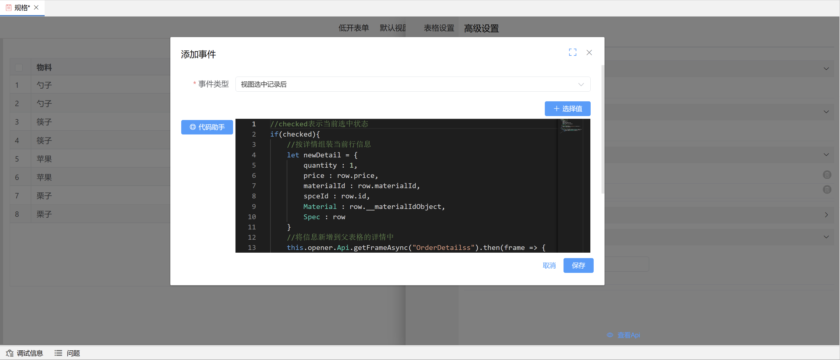 2.在物料规格信息视图中添加事件,当视图选中记录后,判断当前行是否被勾选。如果是,通过this.opener.Api.getFrameAsync("").then(frame => {frame.Api.newRow()})获取父页面的属性并将选中行插入其中;如果否,通过循环将当前行的数据从父页面删除。