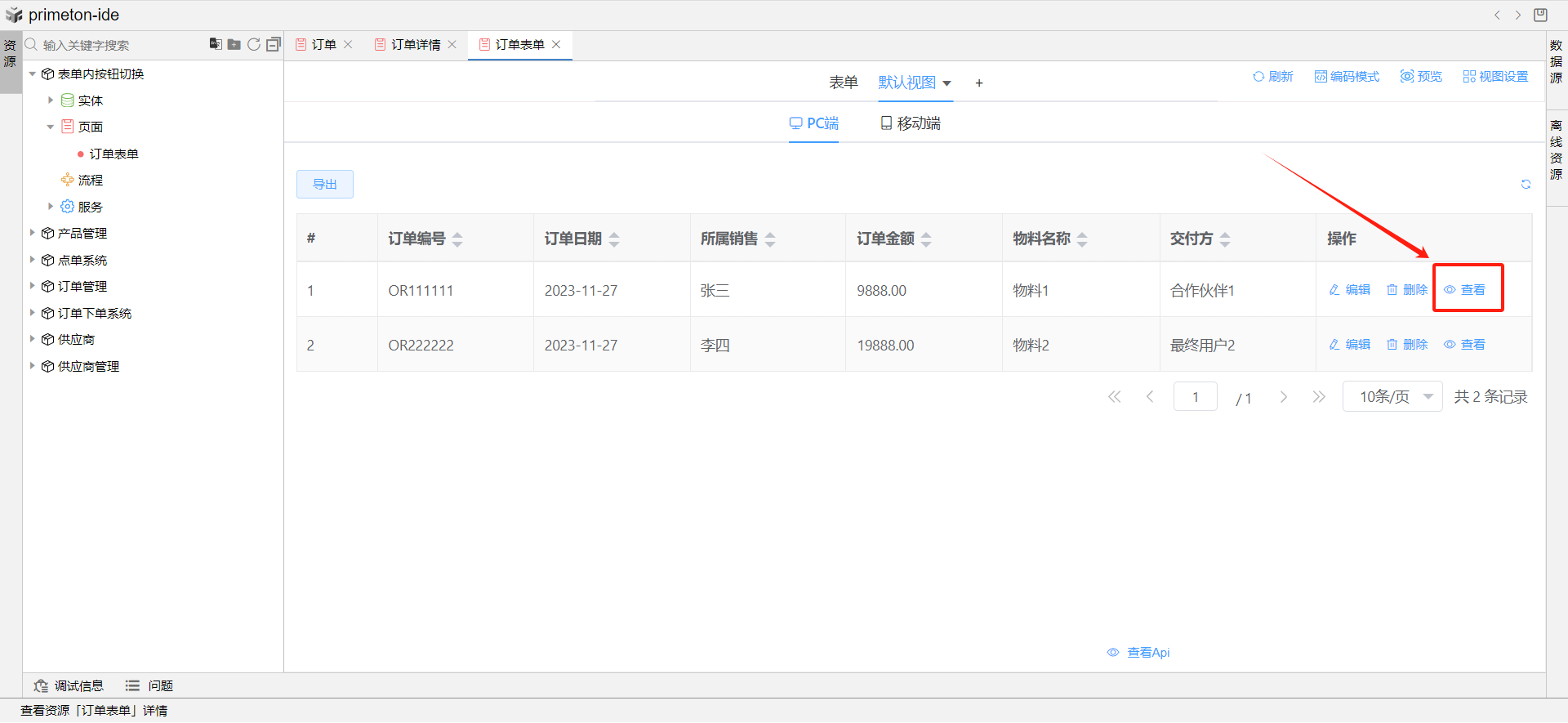 进入订单视图页面,打开浏览器调试模式,点击列表的查看按钮。