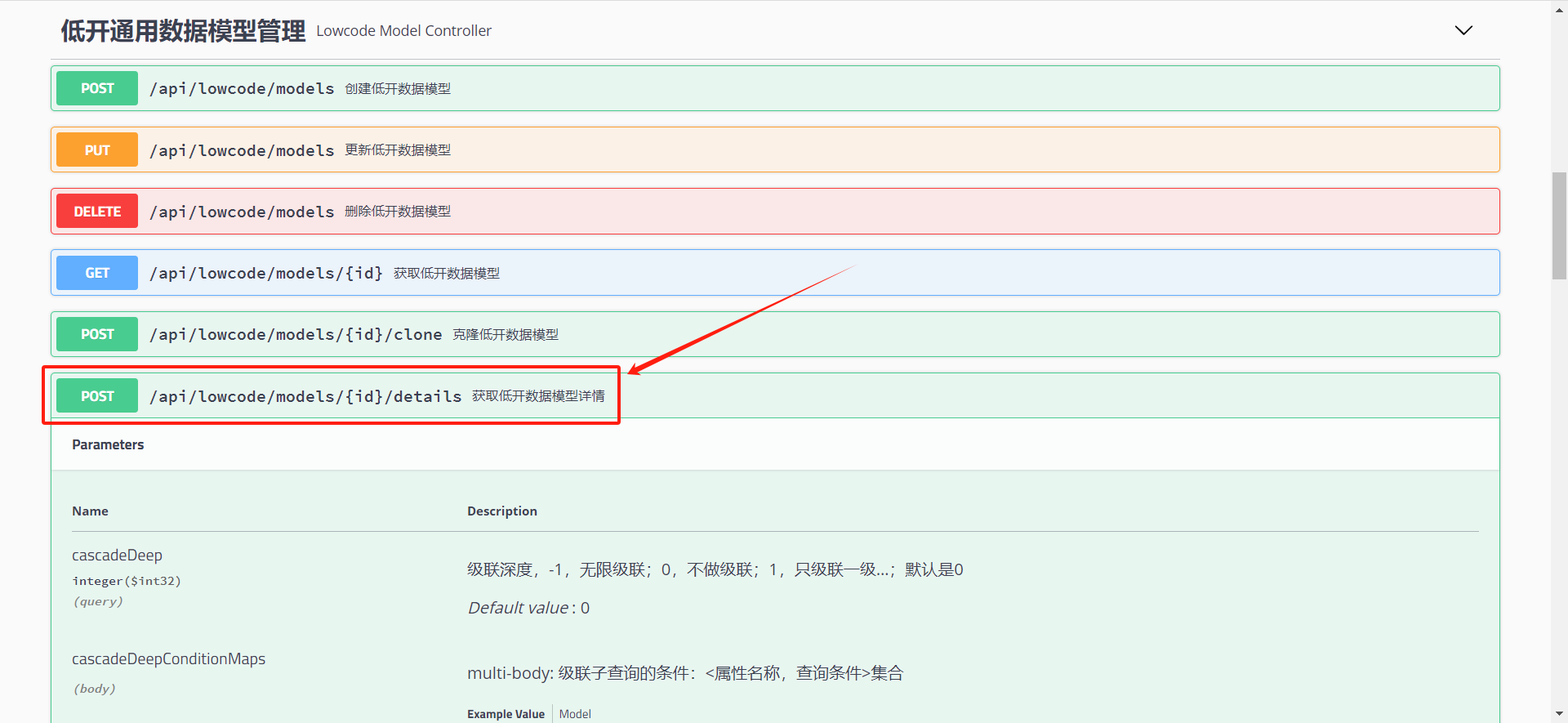 浏览器打开:http://ip:port/swagger-ui.html?urls.primaryName=lowcode#/低开通用数据模型管理/getDetailsUsingPOST_1