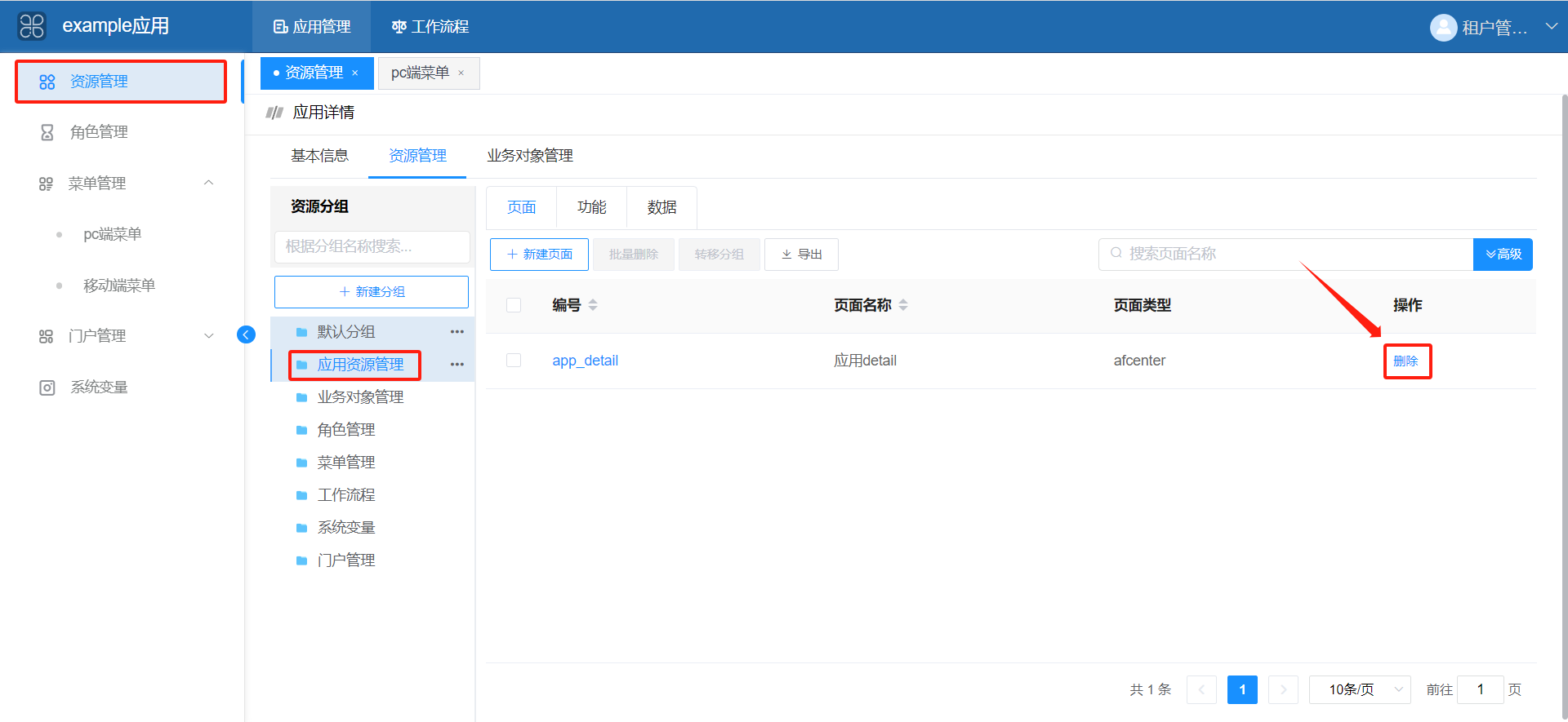 在应用管理-资源管理中-资源管理,删除全部资源,包括页面、功能和数据。