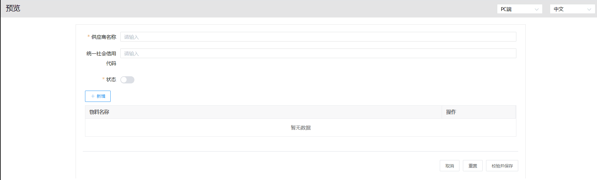 在供应商表单自定义一个按钮,调用表单校验接口,对表单进行校验,表单需通过校验后才能保存,表单校验不通过则无法保存。