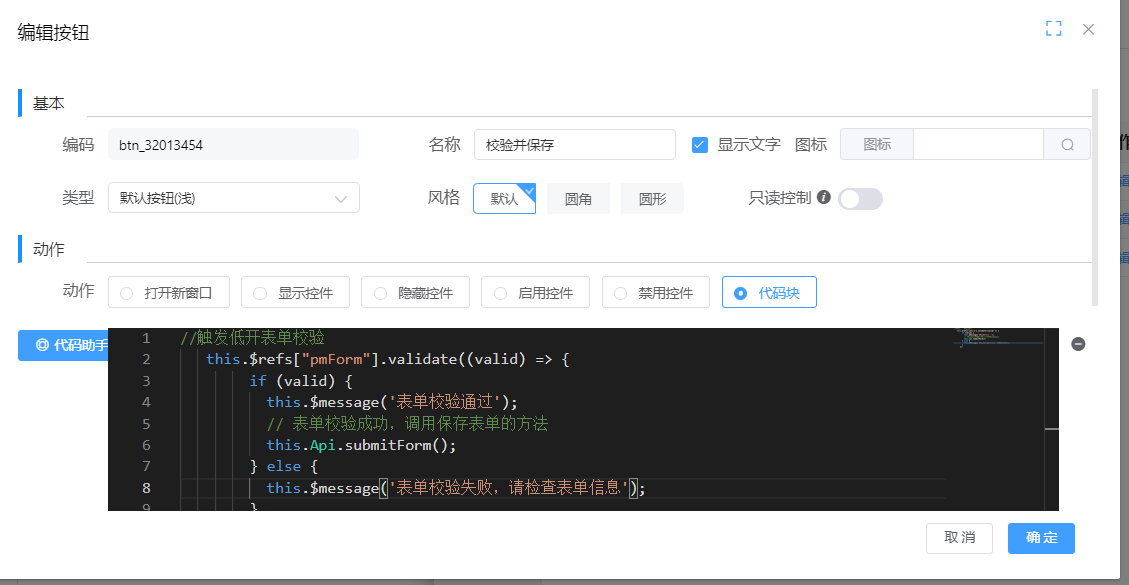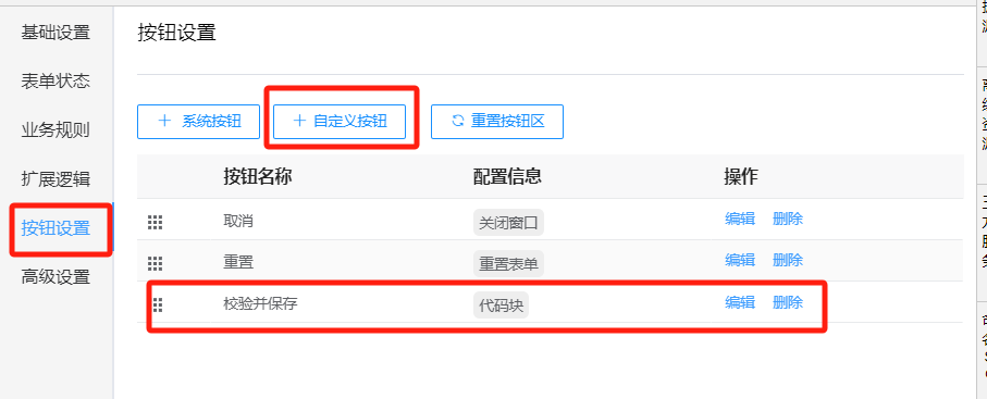 对自定义按钮进行编辑,名称改为“校验并保存”,添加动作代码块,调用表单校验接口。