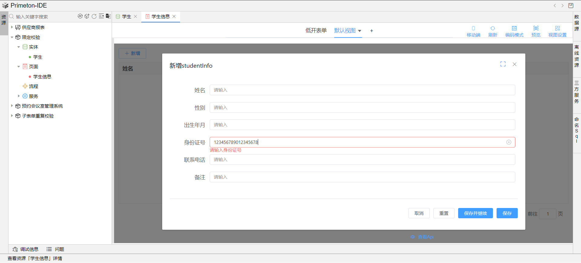 在学生信息表单内,限定身份证号字段的输入格式,正确输入才能提交表单。