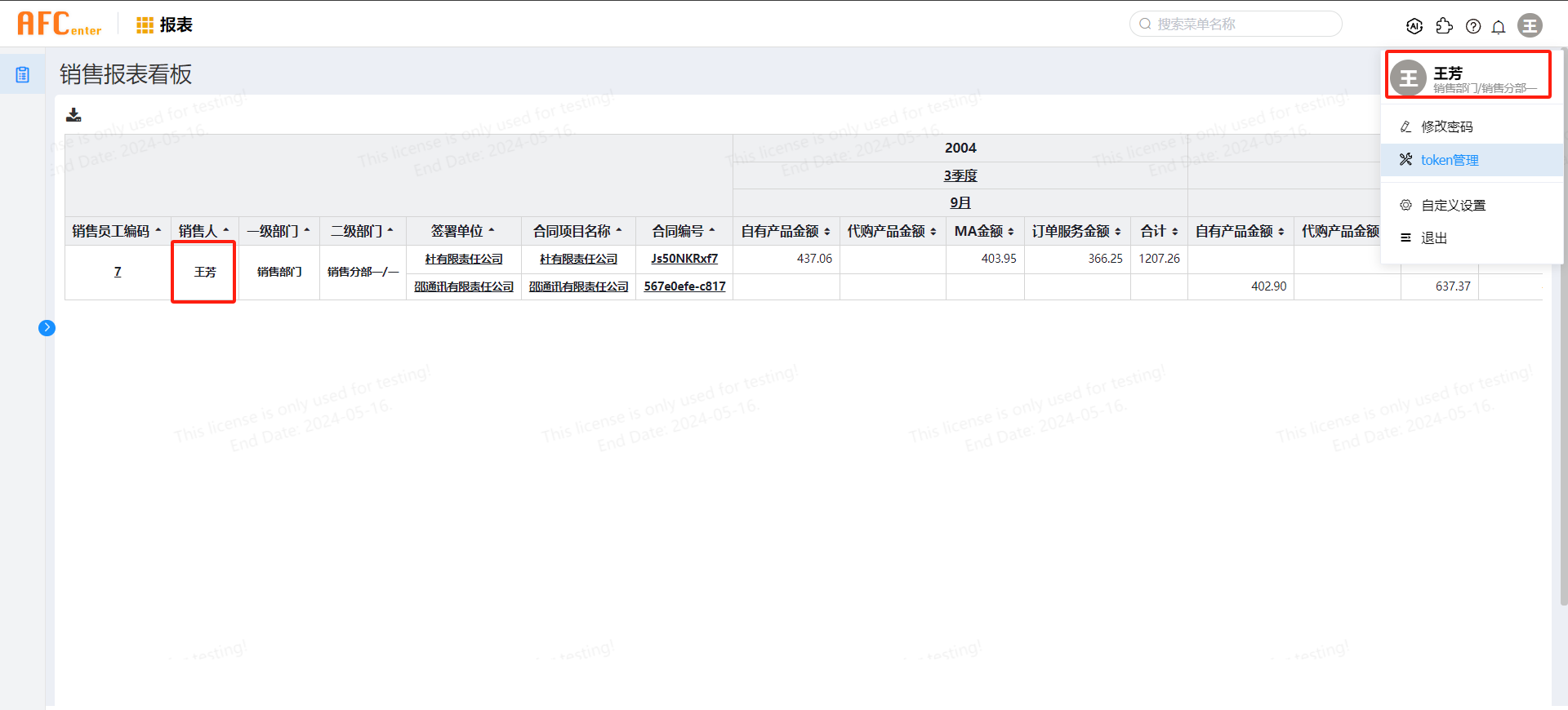 注:该案例中不提供示例数据,销售业务数据表中的销售员工编码和销售人,实际需要和AFCenter员工表中的ID和NAME字段值对应,才能通过获取当前登录用户的员工id来对报表的数据显示做范围控制。