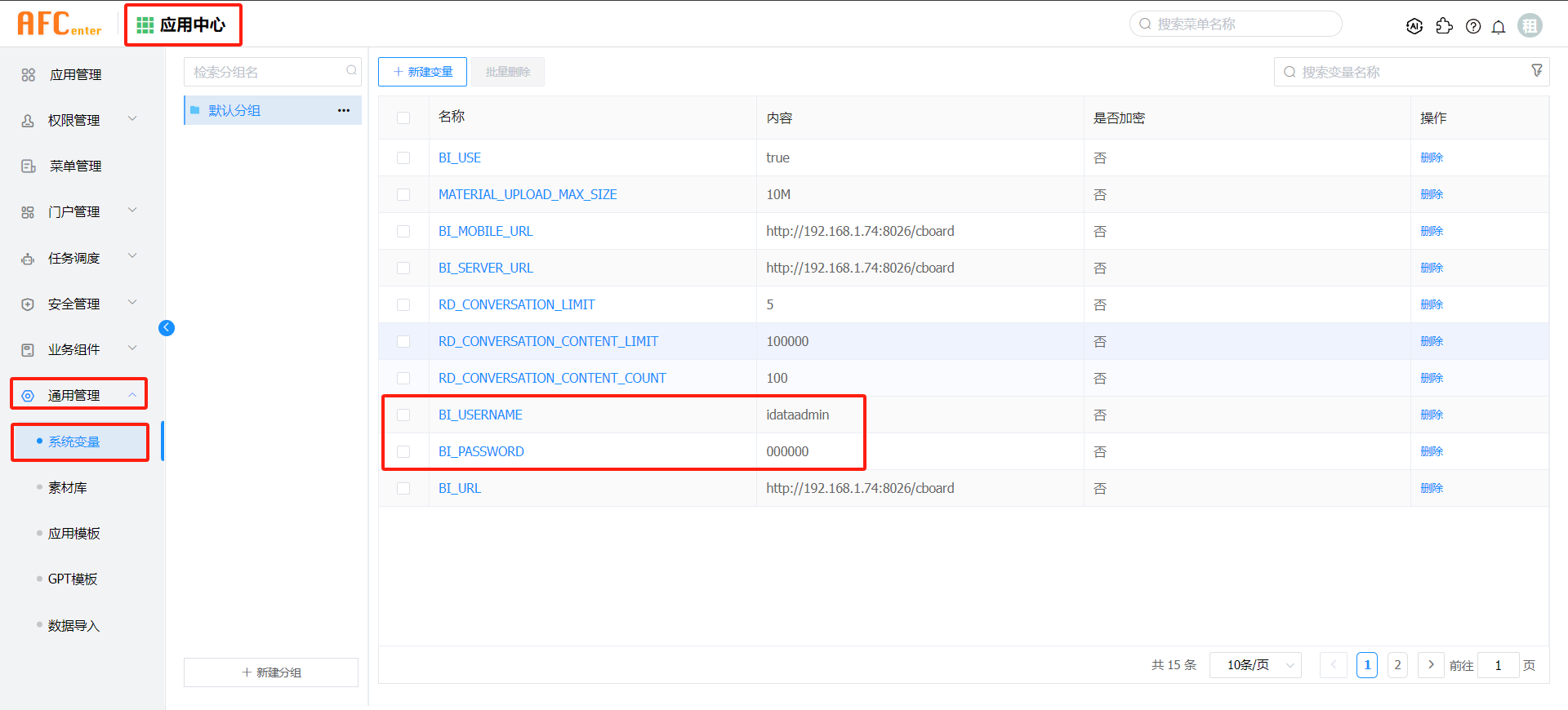 在AFCenter-应用中心-通用管理-系统变量,修改BI_USERNAME和BI_PASSWORD为上一步创建的报表数据管理员(idataadmin)。