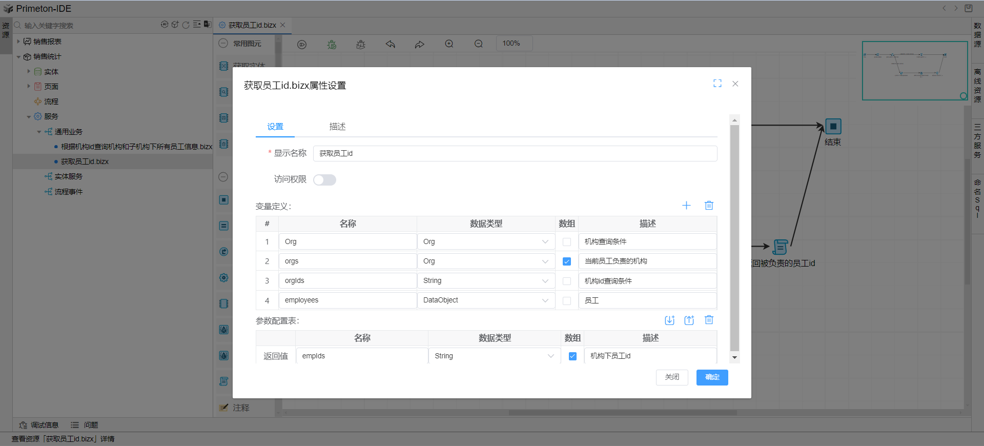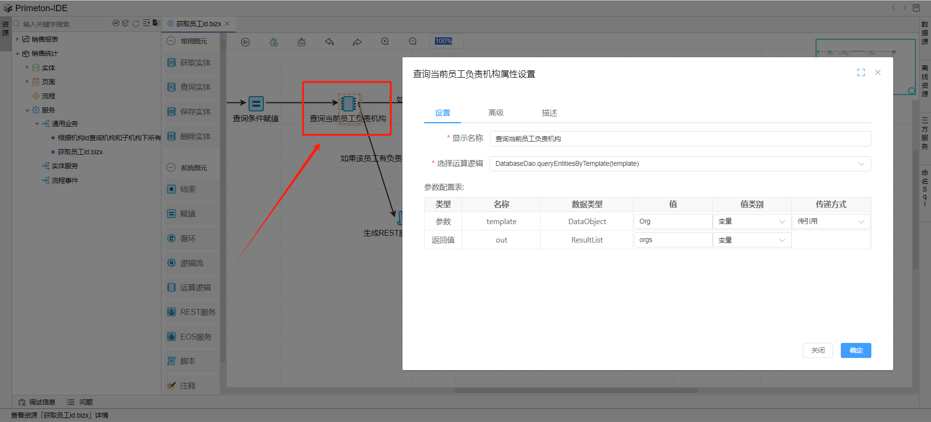 连接一个查询实体图元,用Org查询条件,查询出当前员工负责的所有机构,参数:Org 变量 传引用,返回值:orgs 变量。