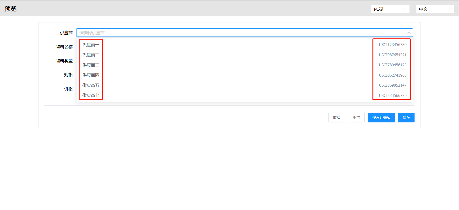 在物料与供应商关联的表单中,供应商下拉组件可以同时显示供应商名称和供应商统一信用代码。