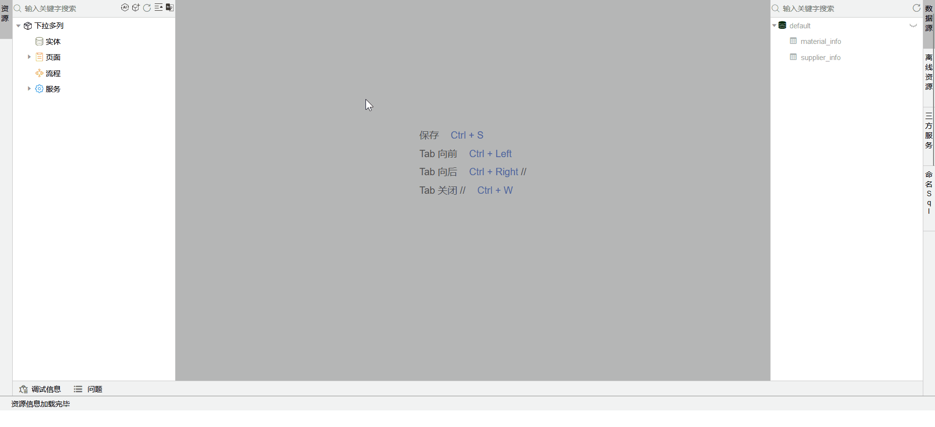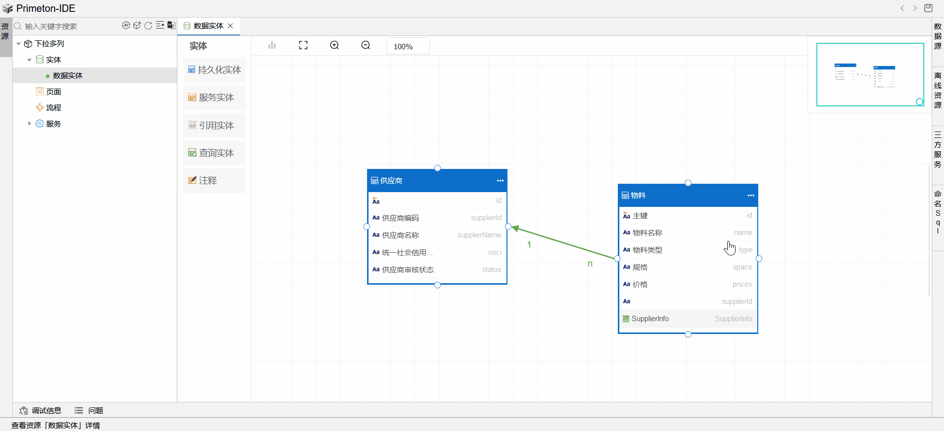 创建数据实体,拖拽两张表至页面,添加关联关系。