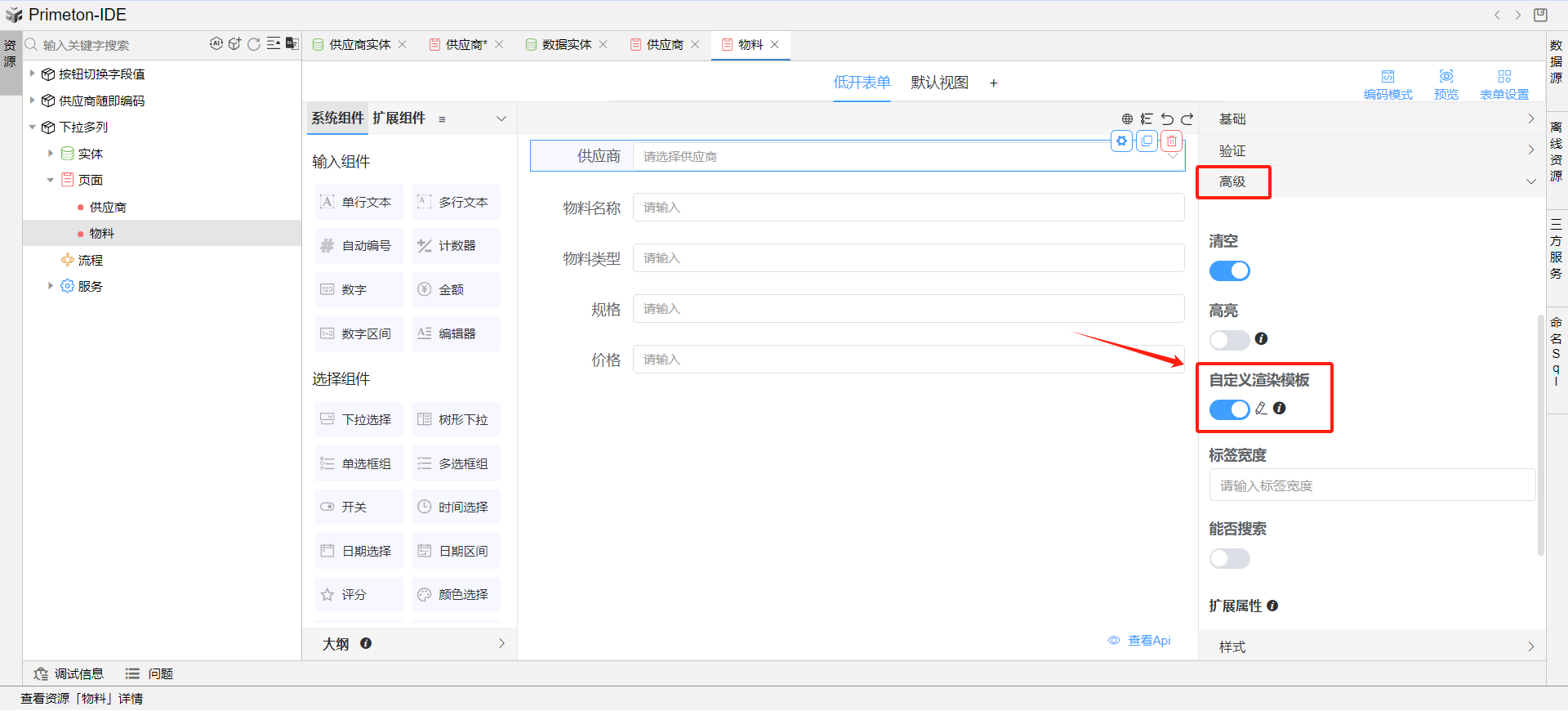 点击供应商下拉组件,点击高级,勾选自定义渲染模板,编写html代码。