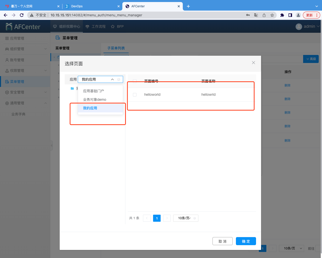 使用admin账号进入AFCenter 应用管理菜单->创建应用。