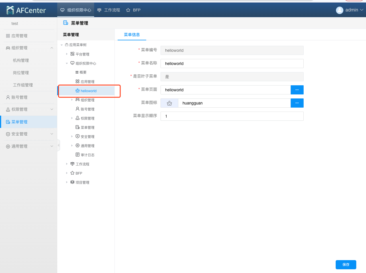 给admin用户helloworld的菜单权限。