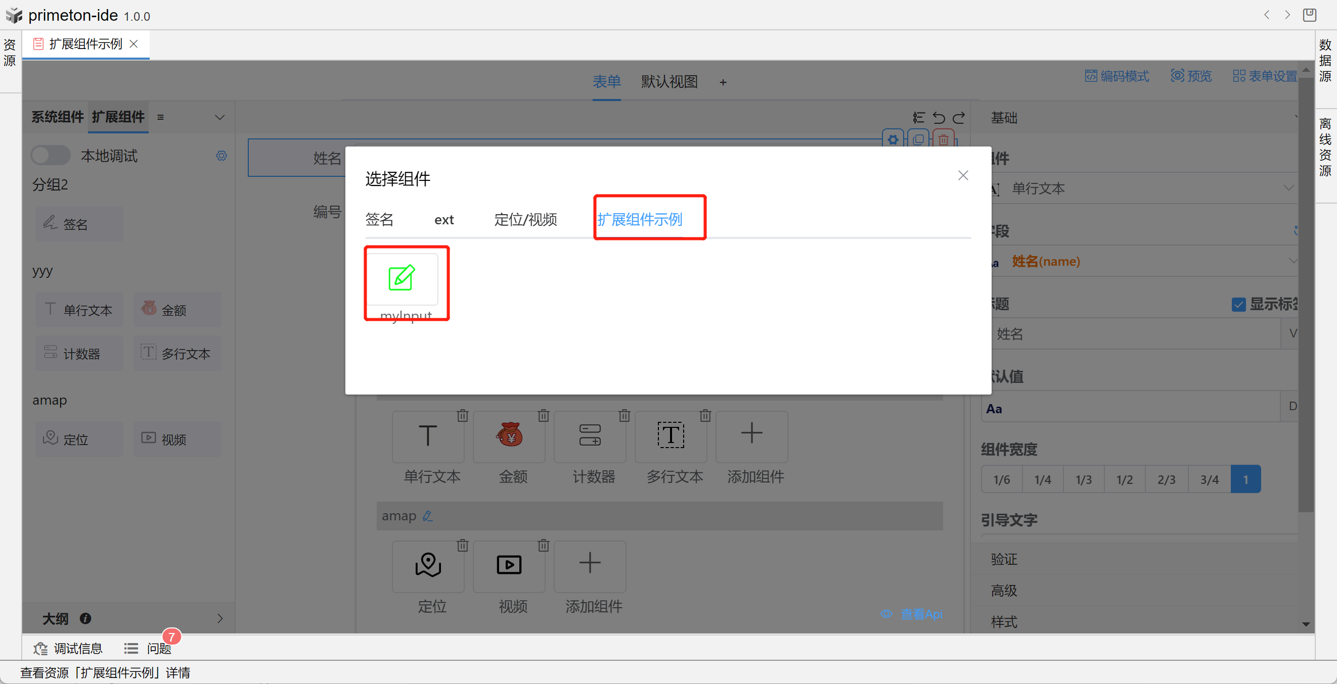 上传组件后,打开组件选择区的扩展组件界面,拖拽对应扩展组件到表单编辑区,添加成功后可看到扩展组件页面
