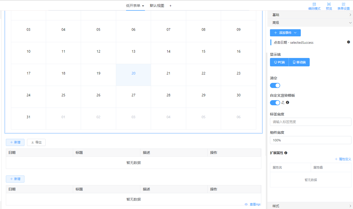 新建表单,拖动一个日历组件和两个资源容器组件(样式隐藏全量视图);