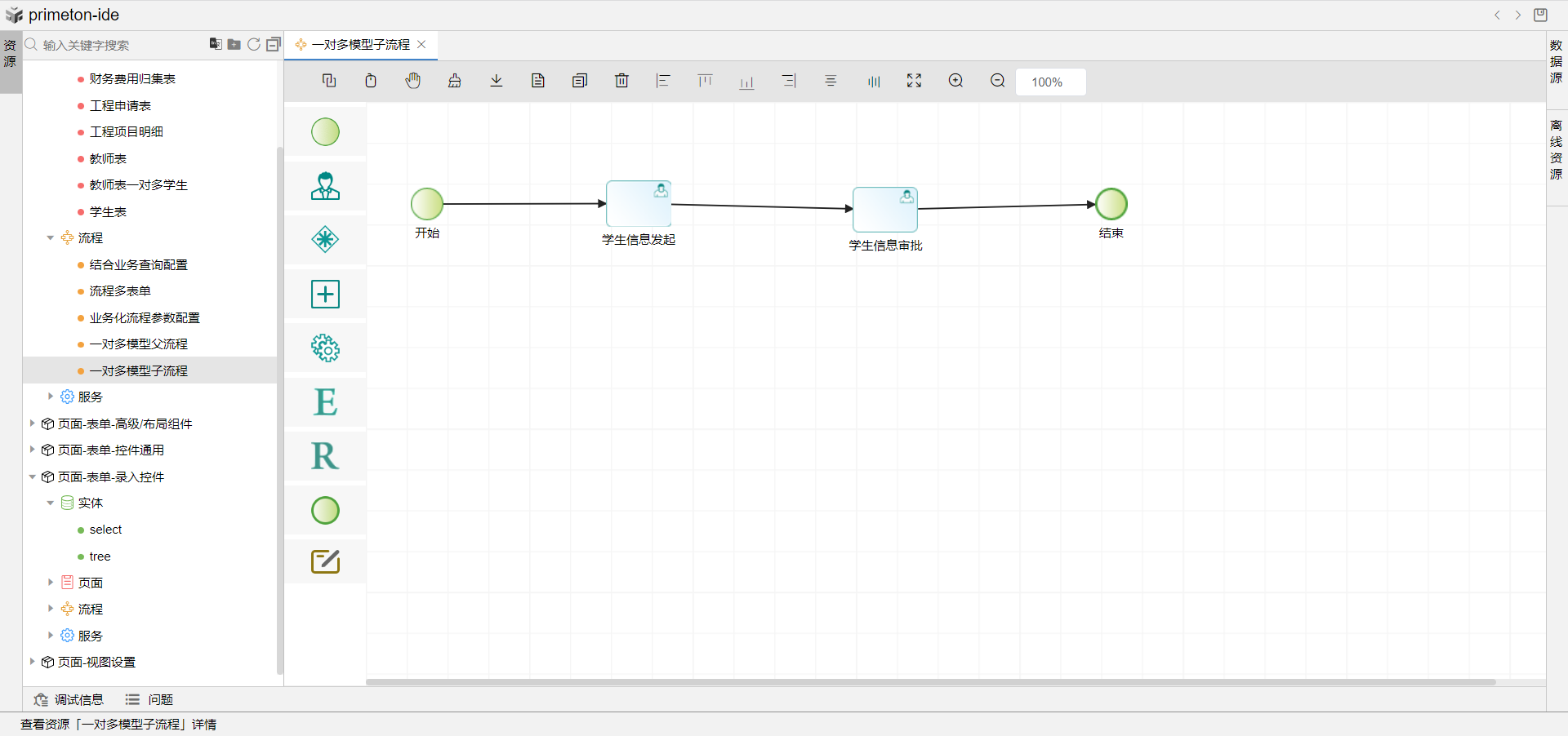 3.根据数据实体创建父流程表单页面,1端作为主流程页面,需要拖选子表格组件,绑定n端默认视图,子表格绑定数据实体n端字段,编辑模式选择弹窗,保存主流程。