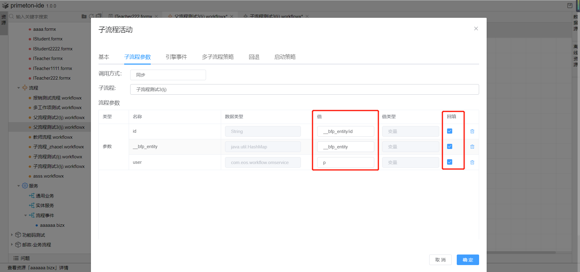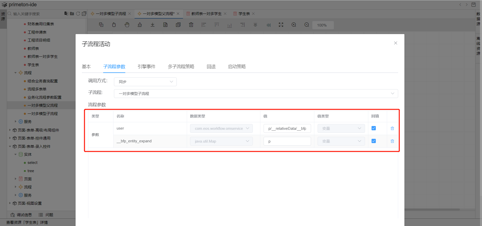 7.选择子流程参数tab页,选择刚刚创建的子流程,为子流程参数赋值,并勾选回填。