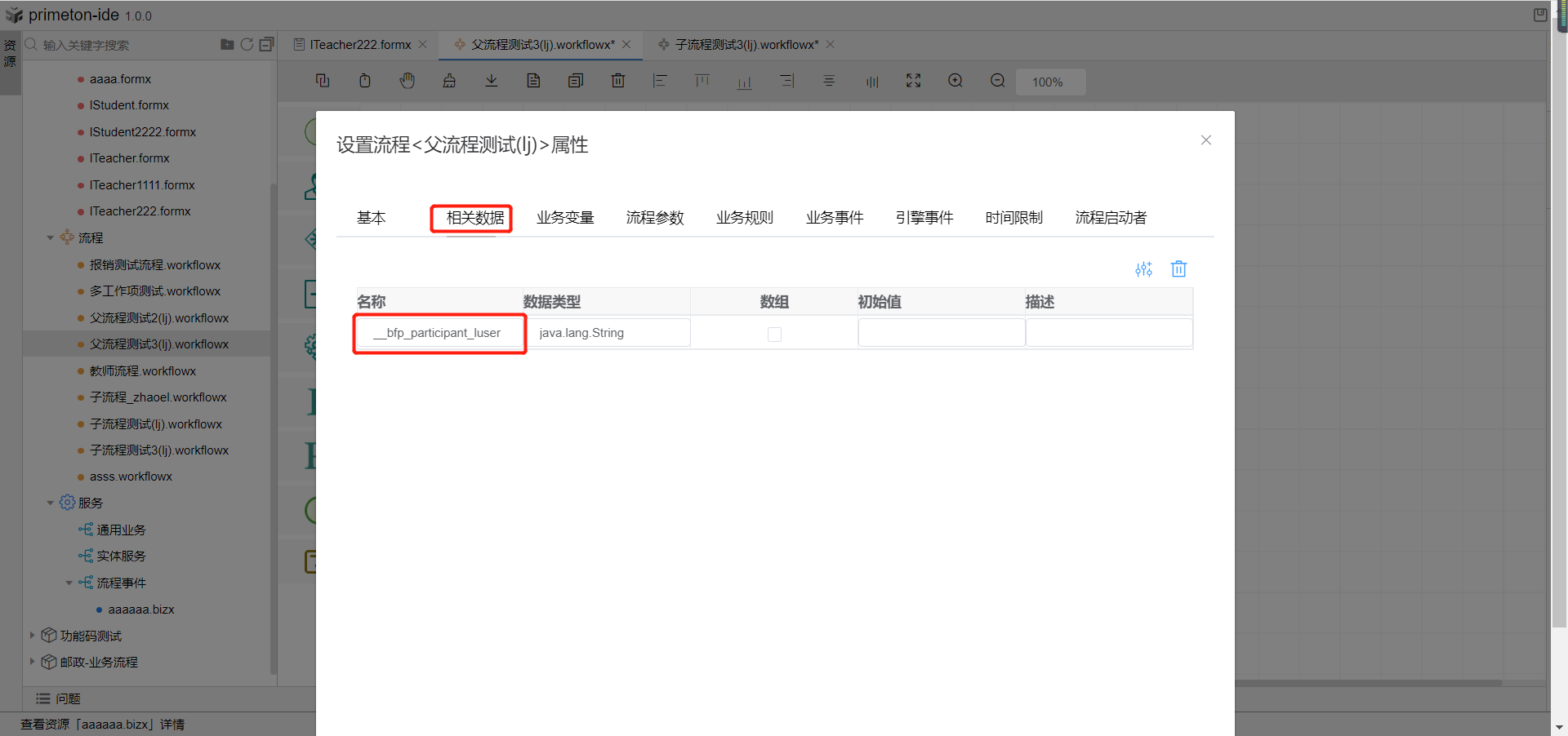 3.创建父流程,双击流程空白处,点击相关数据tab页,添加相关数据,将父流程表单中复制的xpath值粘贴在相关数据名称中,类型为string。