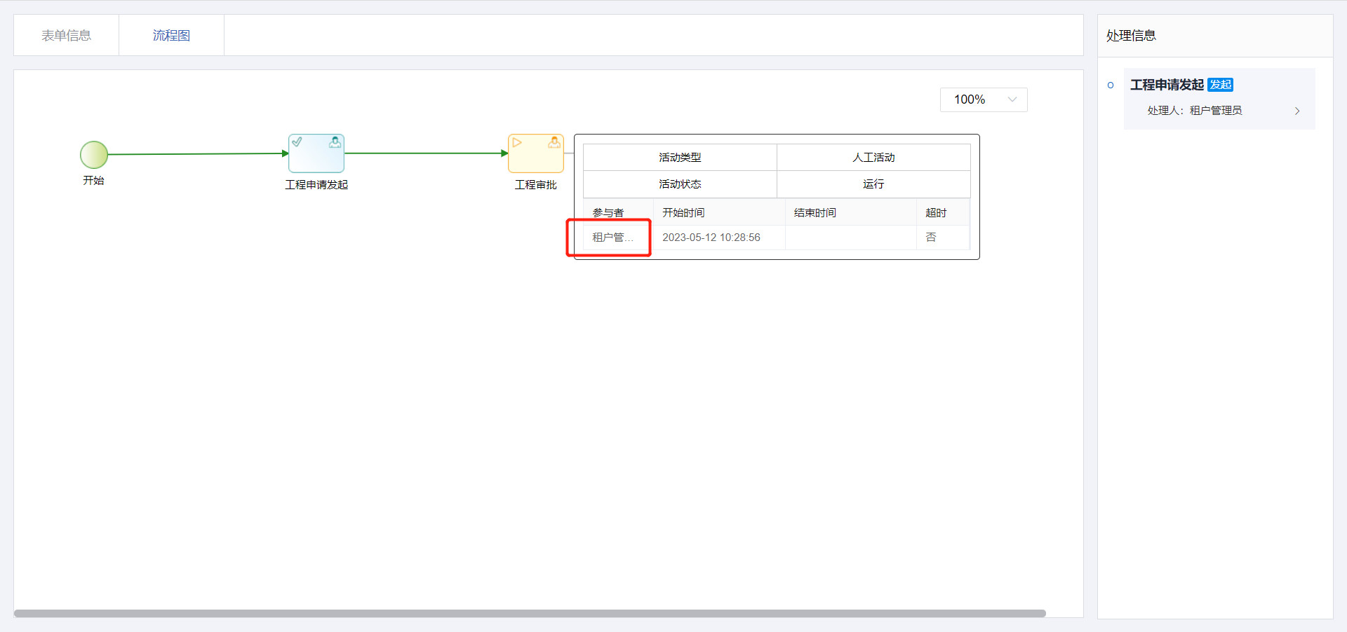 使用自定义参与者规则功能,在工程申请表单填写金额大于5000时交由具体人员张三审批,工程审批金额小于等于5000时交由租户管理员角色审批。