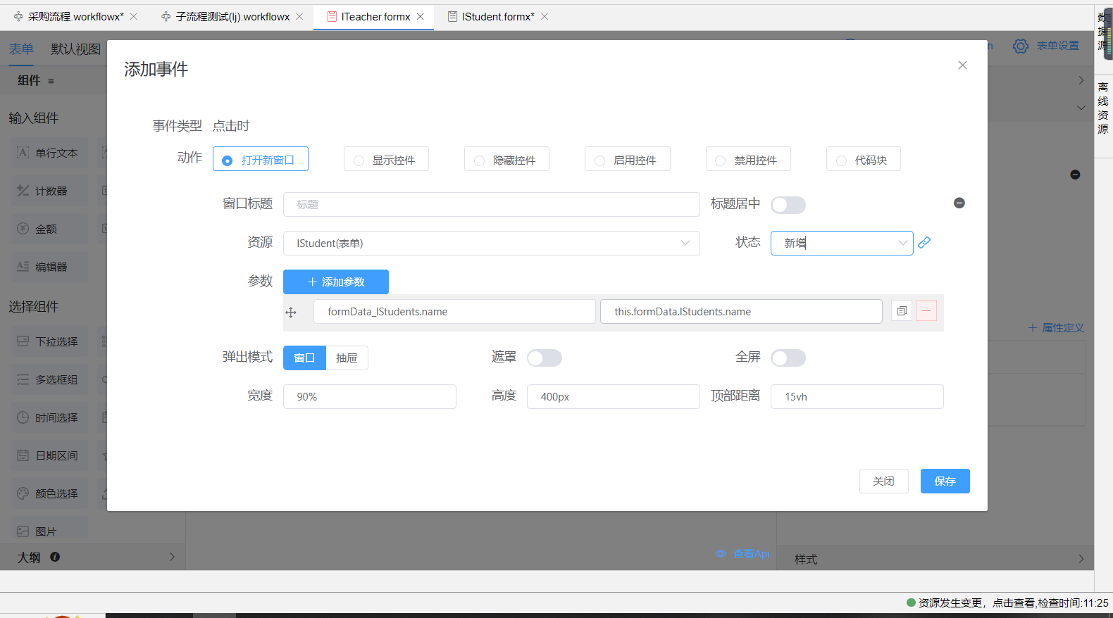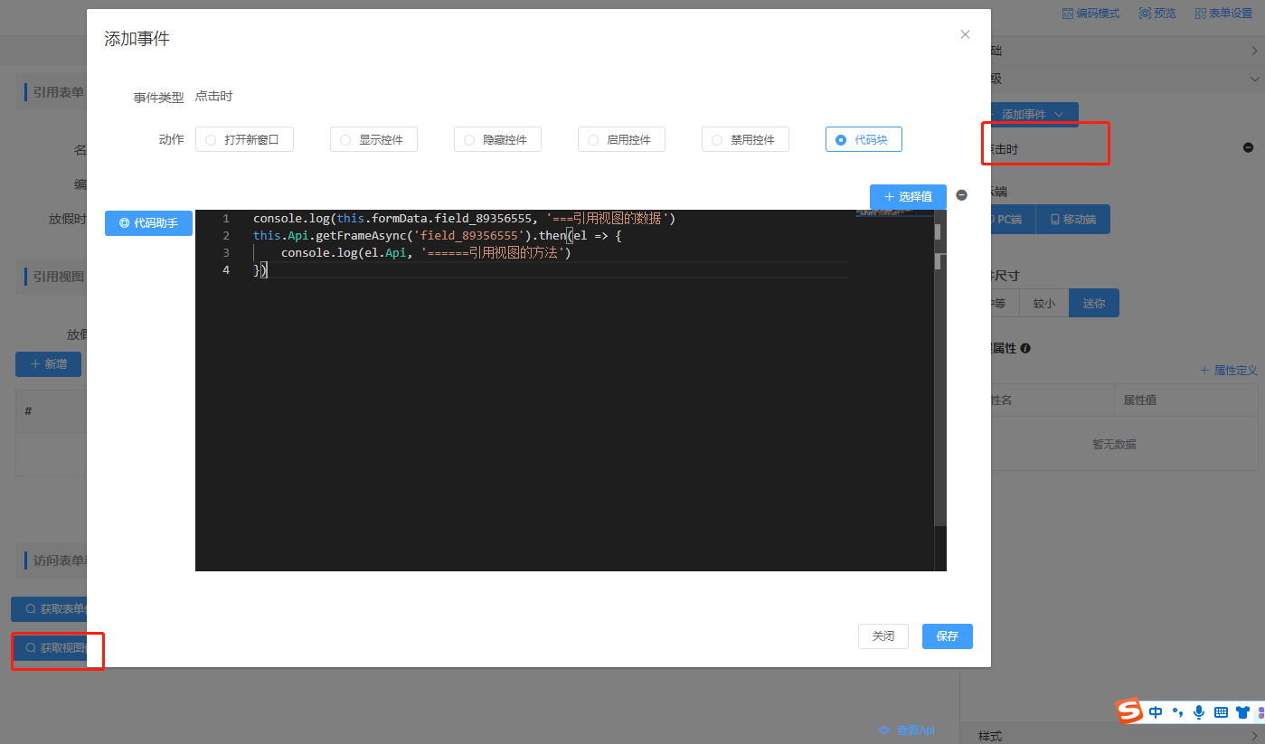 表单或视图按钮上可绑定弹出窗口事件,在打开弹窗中可进行参数传递。
