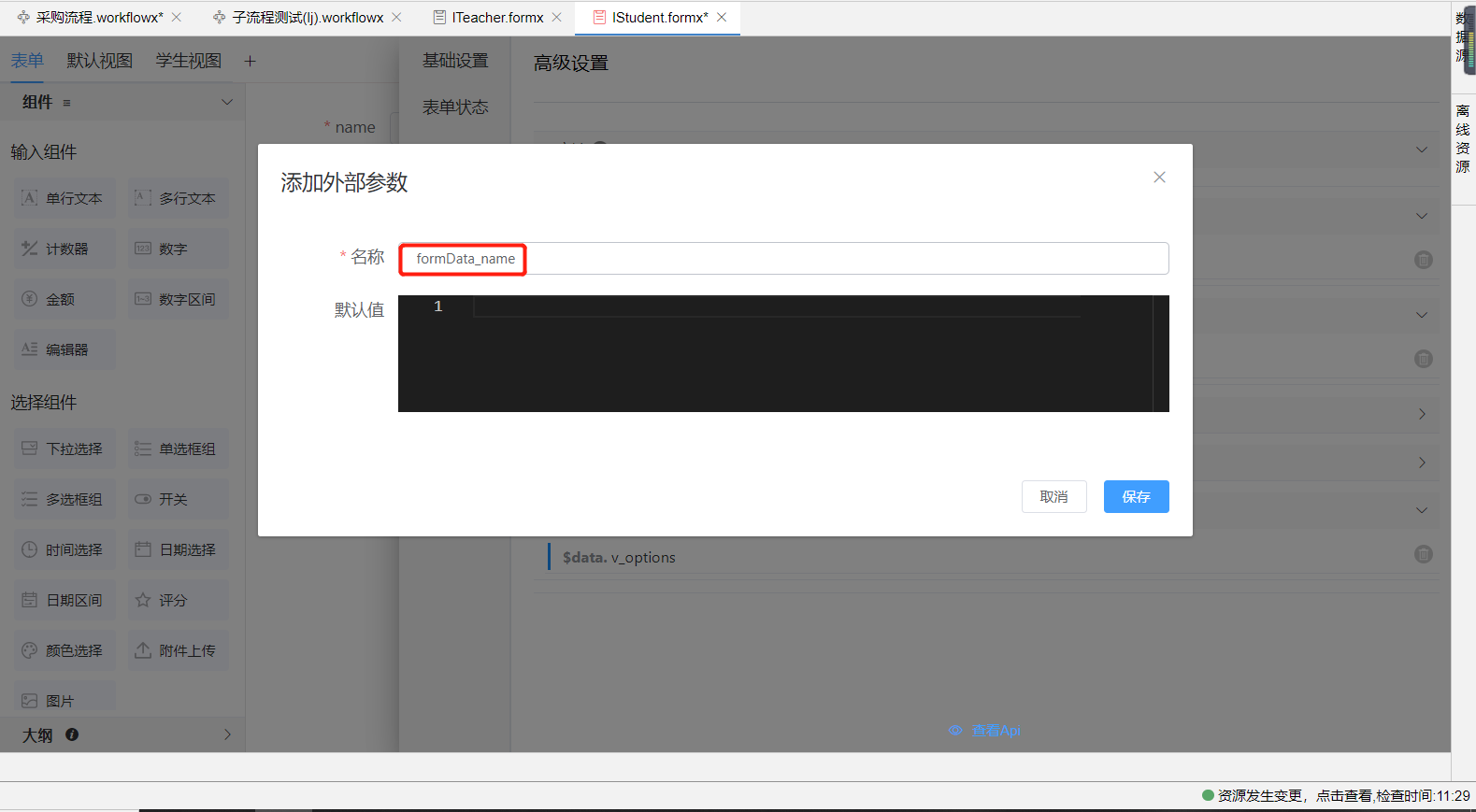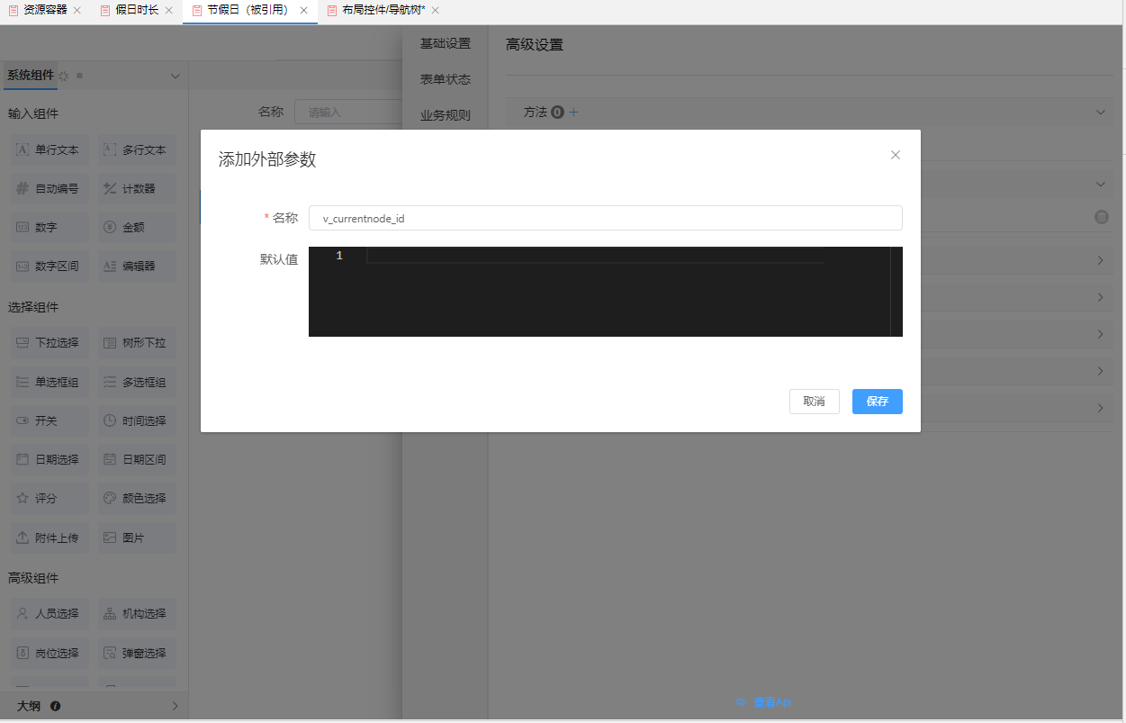 步骤3. 被引用表单配置入参,<节假日>表单的高级设置添加参数v_currentnode_id