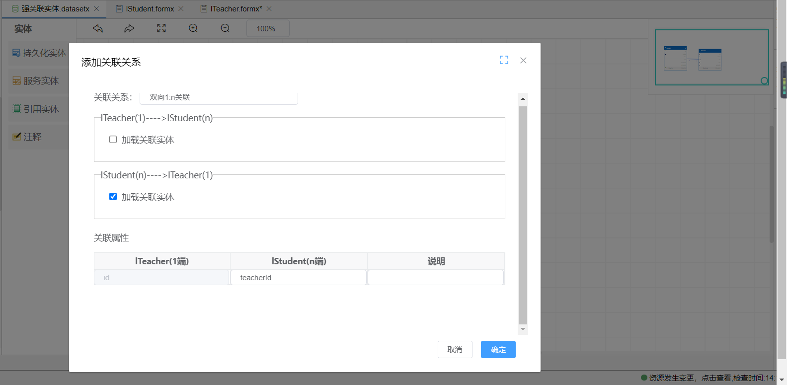 如上图所示:ITeacher与IStudent建立双向一对n强关联关系,建立持久化实体ITeacher、IStudent的表单,在ITeacher表单中拖进子表格控件,绑定IStudent的视图,即可在ITeacher表单中添加IStudent实体数据,通过关联关系将数据提交至数据库。