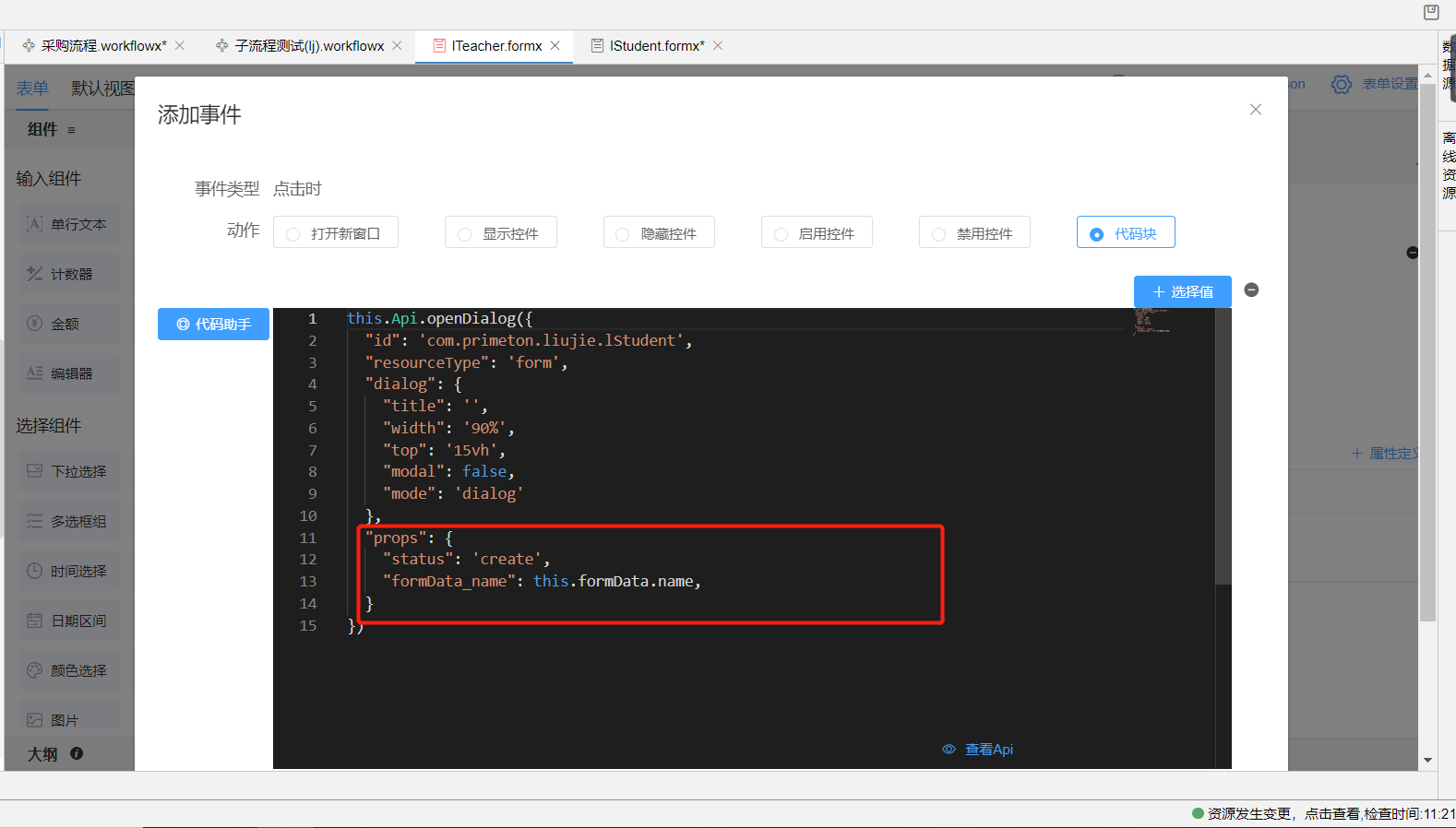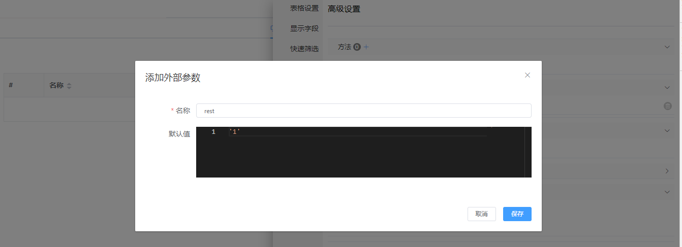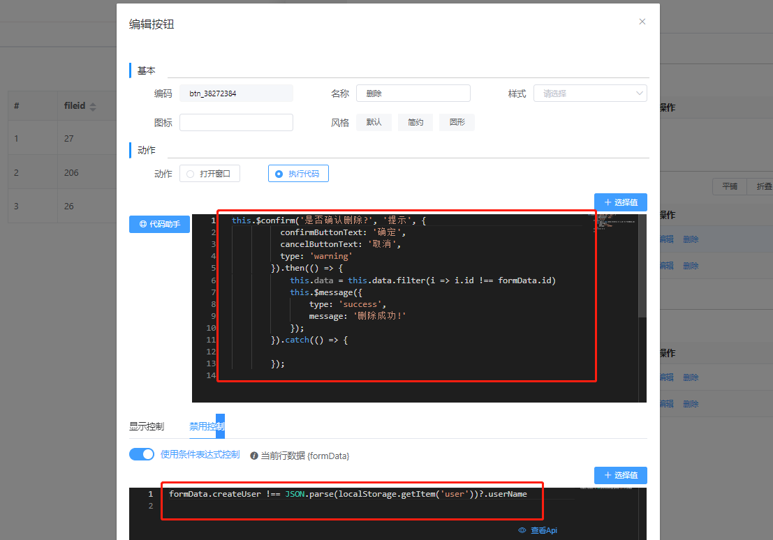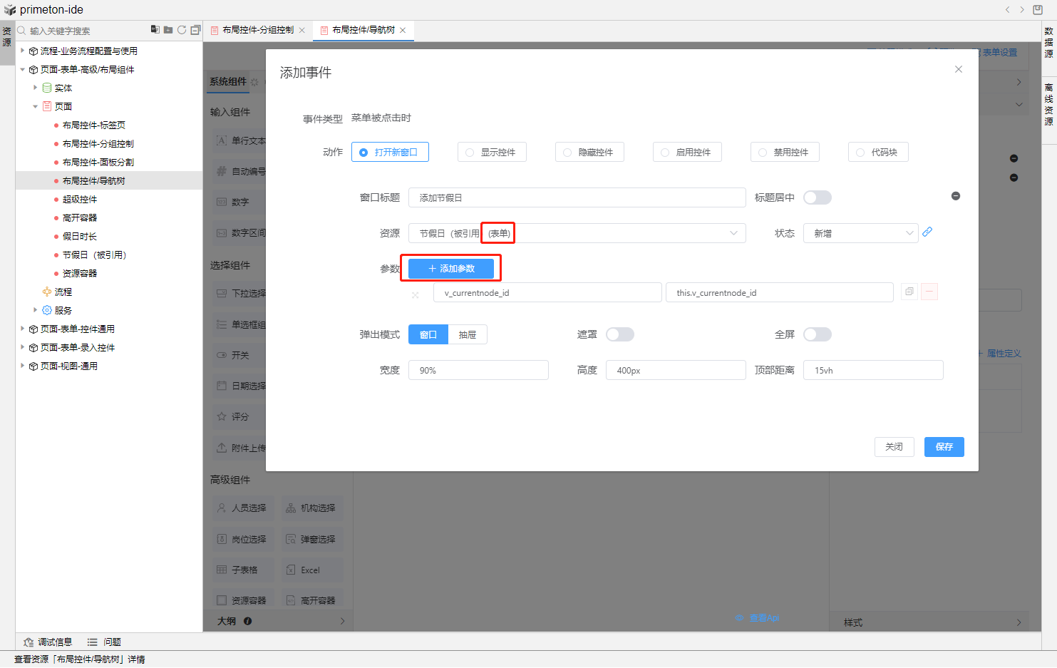 上图为代码块打开弹窗传参,也可使用配置化打开弹窗。