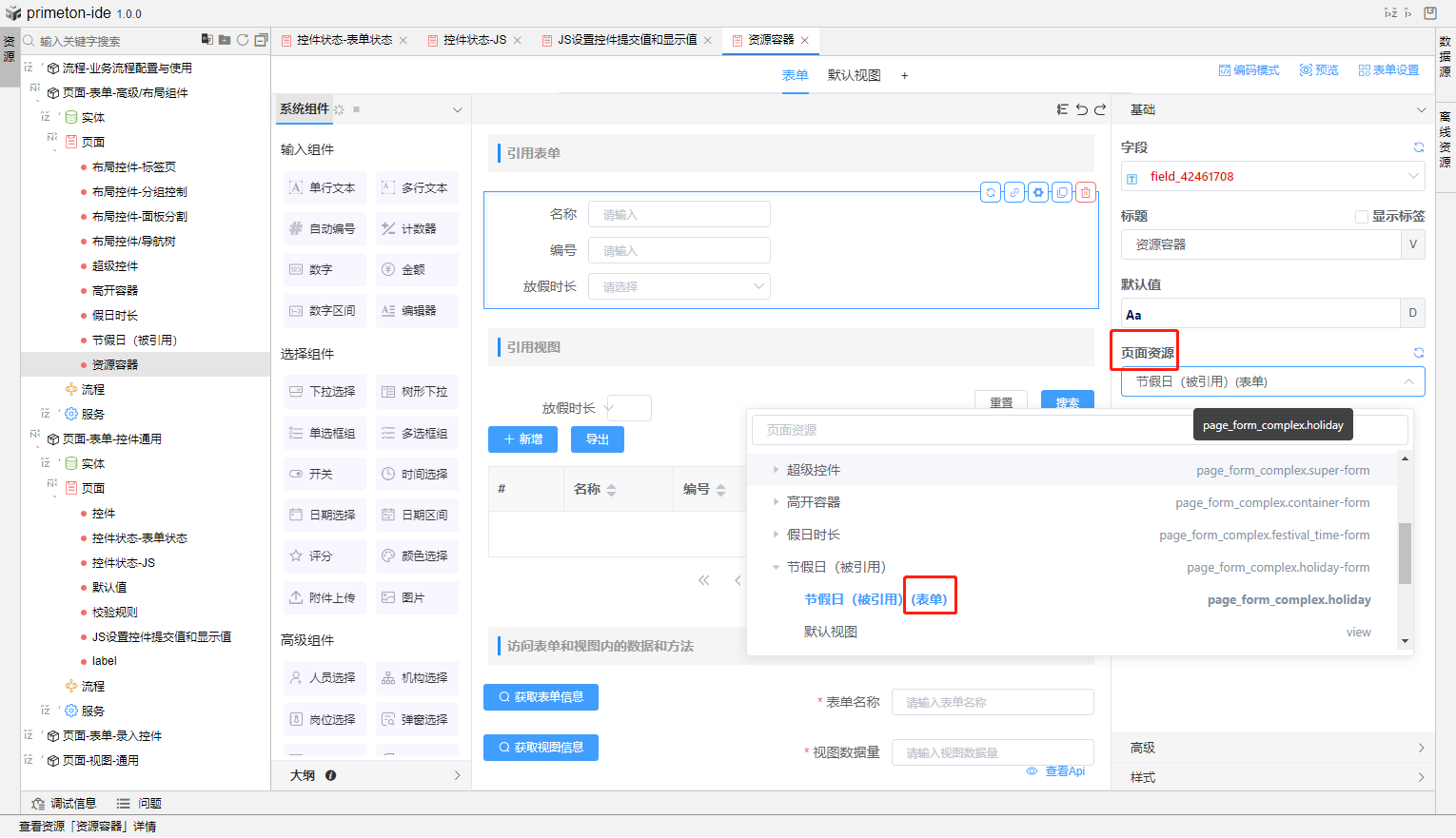 表单编辑器下,高级组件中可使用页面容器组件,该组件可绑定表单资源或视图资源,绑定成功后,即可在当前页面展示出所绑定的表单或视图。