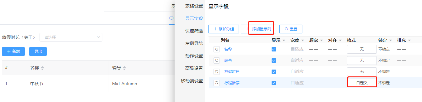 步骤1. 左侧导航树组件—动态数据选择<假日时长>实体,节点配置的基础配置-显示字段(time)和菜单配置添加action(add)