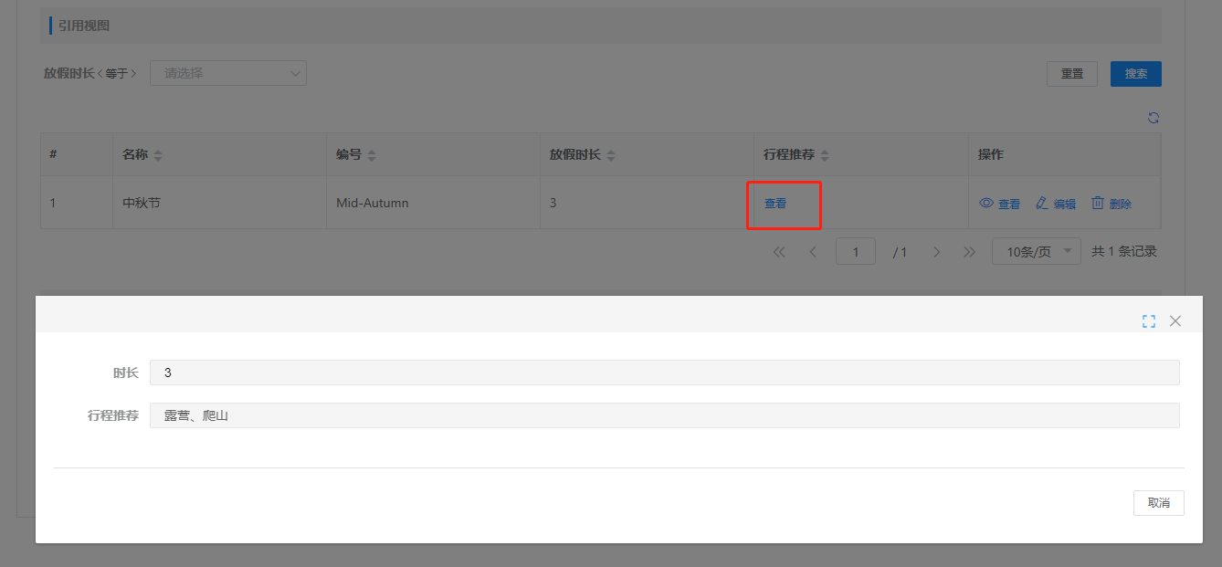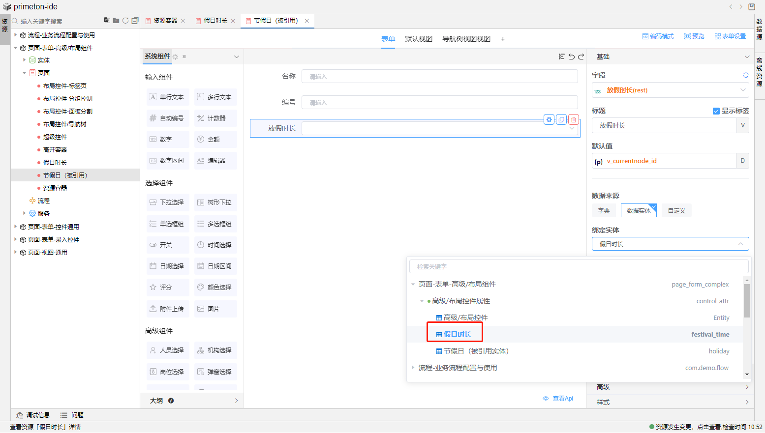 前提:先加载<假日时长>表单,更新视图,并添加视图数据;再更新<节假日>表单,其中控件<放假时长>为下拉框,数据来源绑定的是<假日时长>的实体